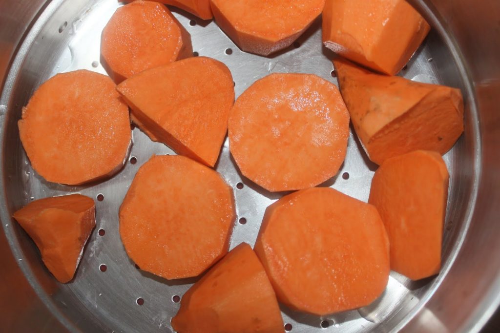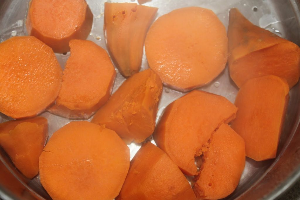 - Faites cuire les patates douces. Il suffit de les éplucher et de les couper en morceaux.