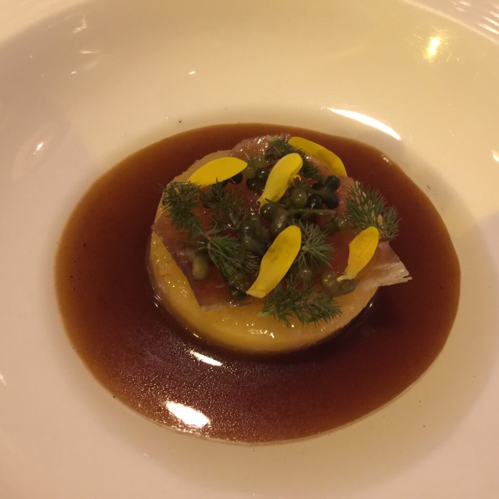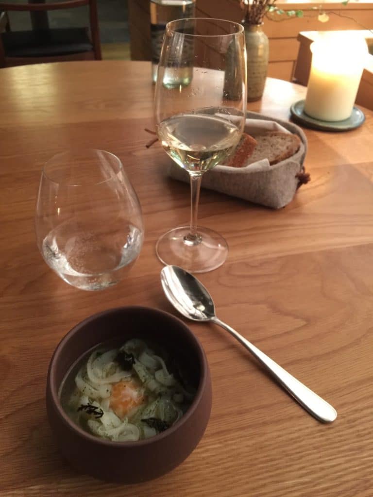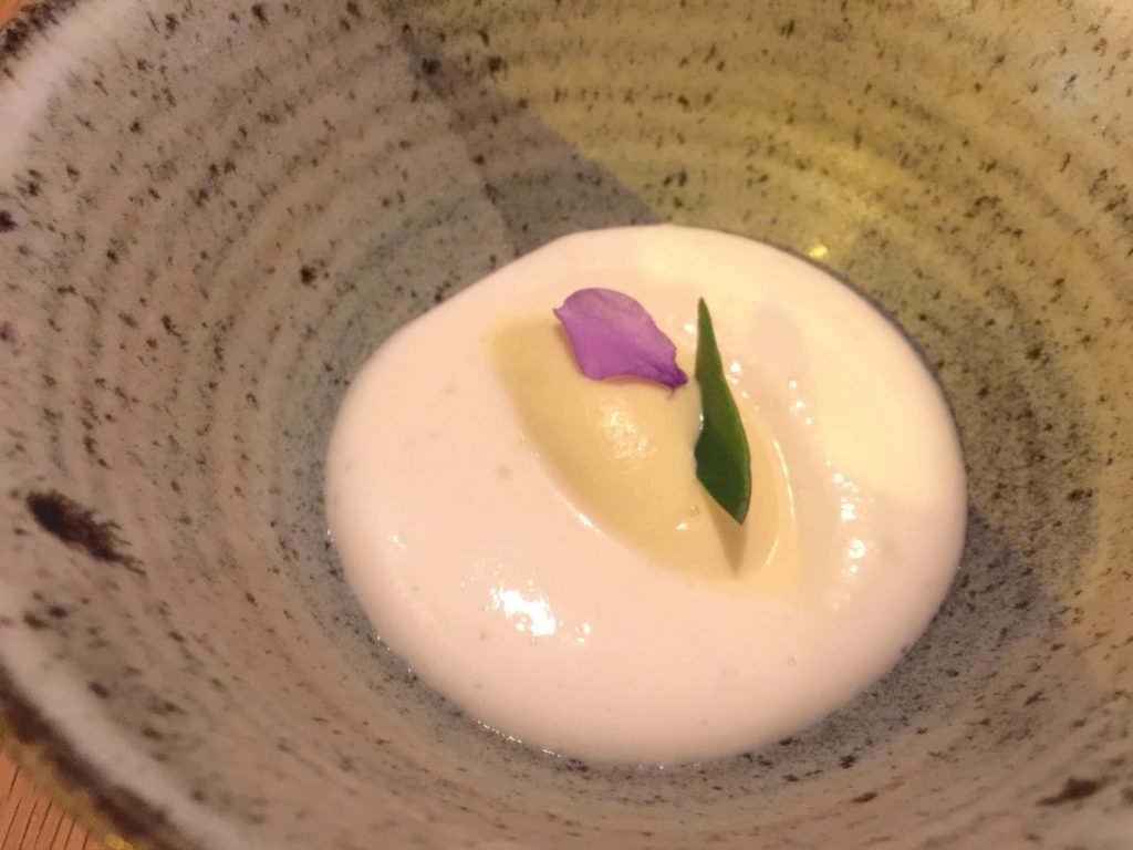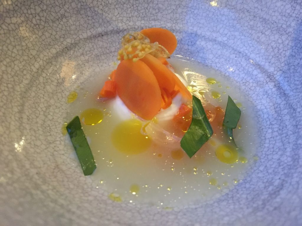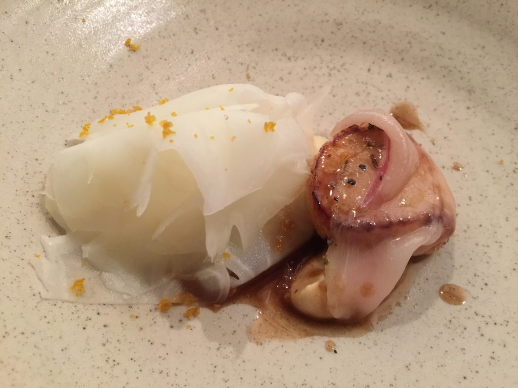 Jour de fête, car en plus on me propose le menu à 9 plats… Avec les 9 vins correspondants. C’est parti pour près de 3 heures de diner. Les plats peuvent paraitre surprenant visuellement (car je préfère toujours la nourriture plus traditionnelle et roborative !) mais je dois bien dire que j’ai été époustouflé par les saveurs, ce qui compte finalement ! Ici un bouillon avec un œuf et du calamar d’une incroyable tendreté.