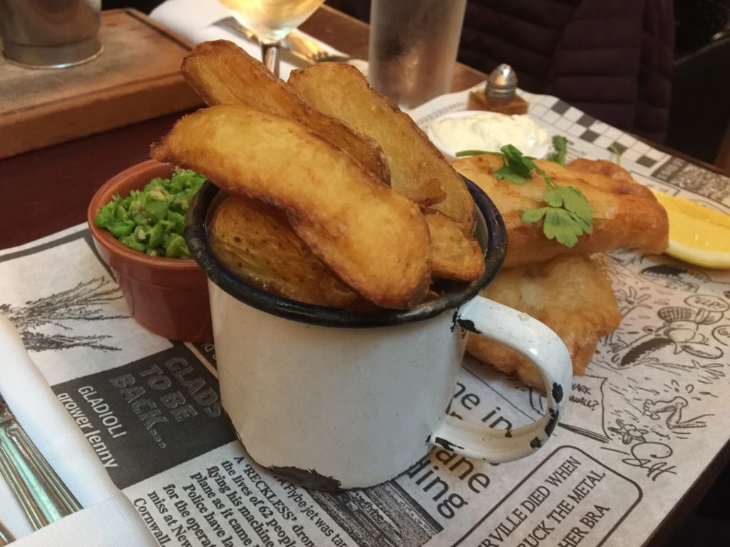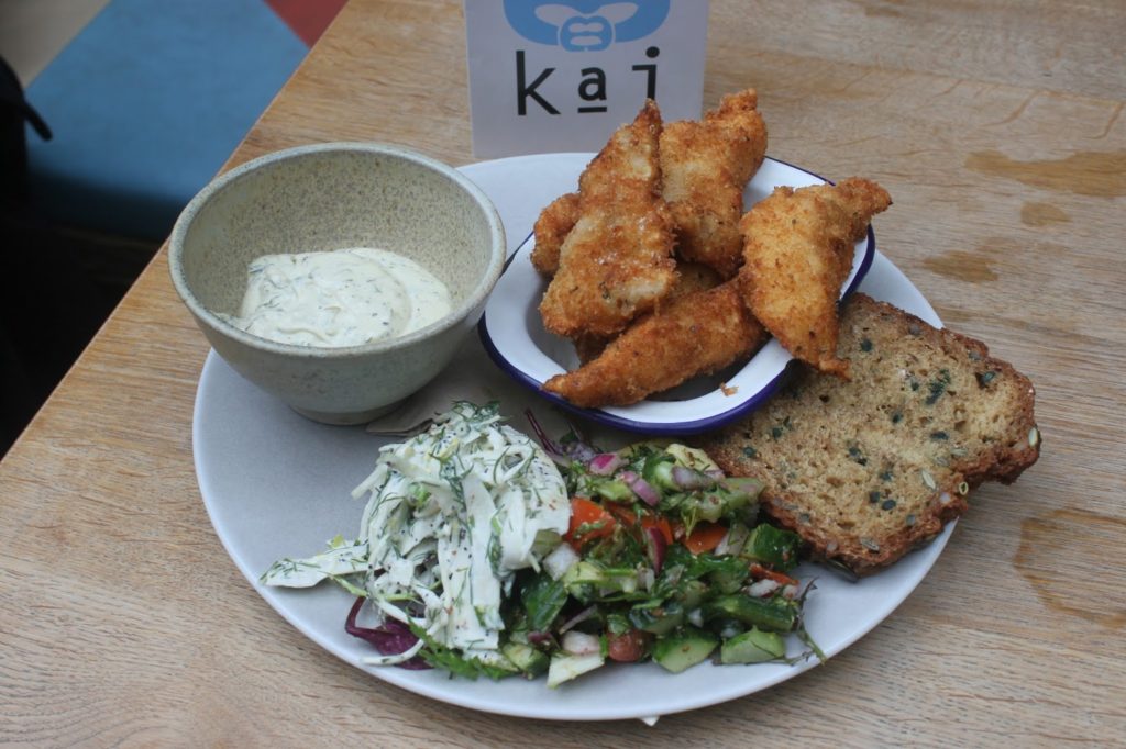 C’est parti pour le déjeuner. On a pris, avec mes deux acolytes, plusieurs plats que l’on a partagé. Ici un (mais alors vraiment vraiment !) délicieux poisson frais pané ultra croustillant avec une sauce tartare, des salades et du pain irlandais maison.