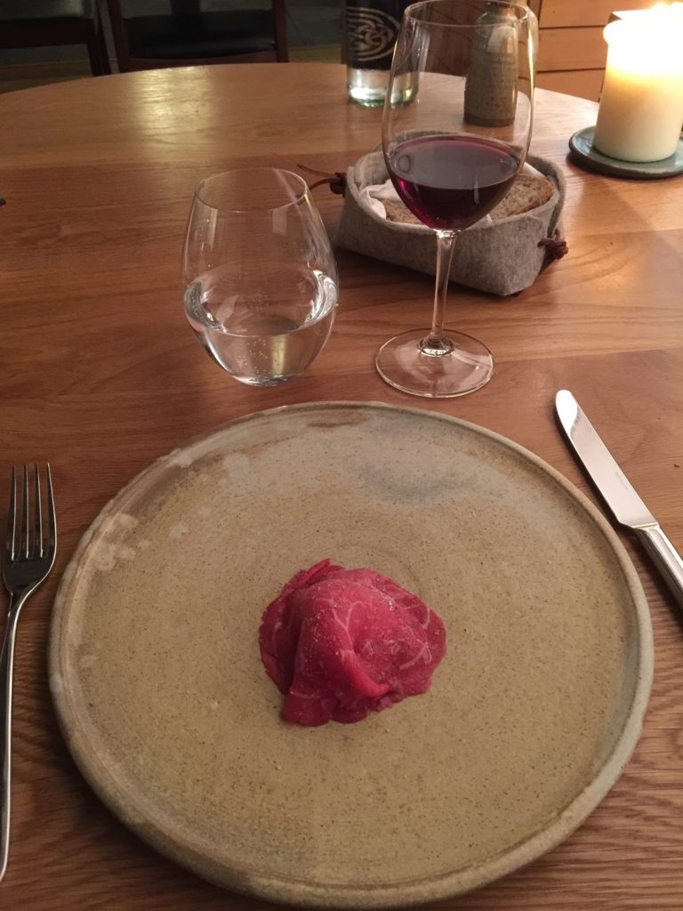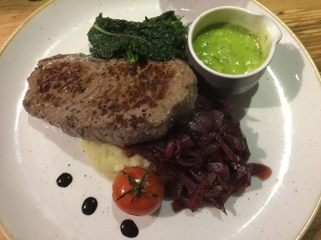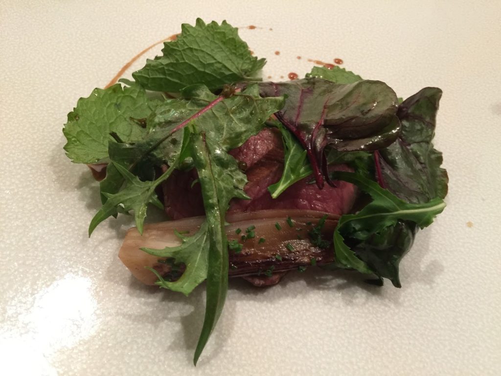 Et en plat, un morceau de bœuf « dry aged beef » avec des oignons rouges au vin et du chou kale, et du beurre d’escargot (en fait du beurre avec ail et persil).