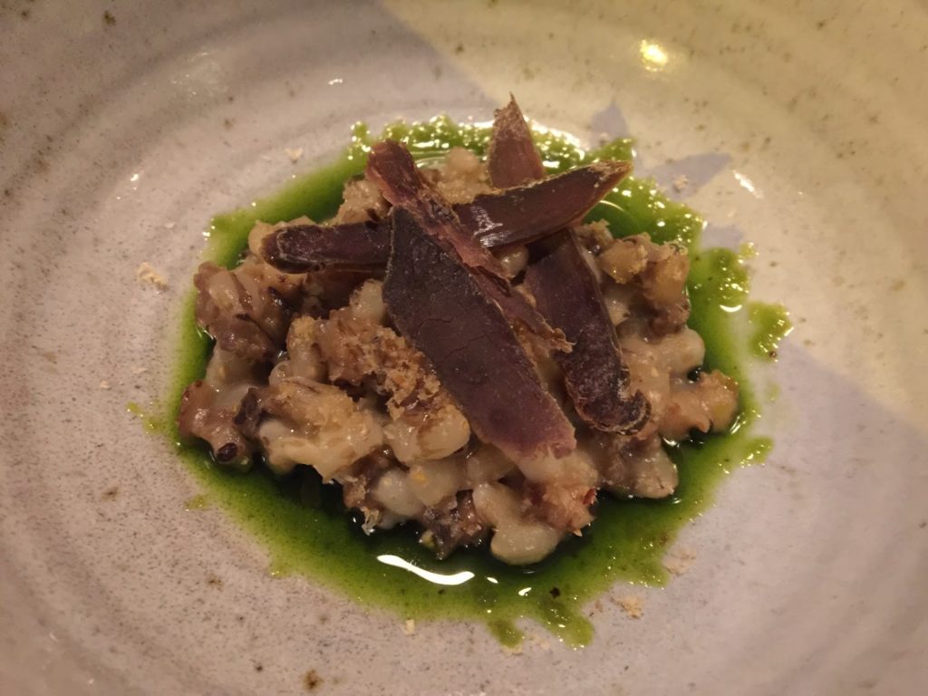 Un risotto d’orge perlé à l’agneau séché et à l’huile d’aneth.