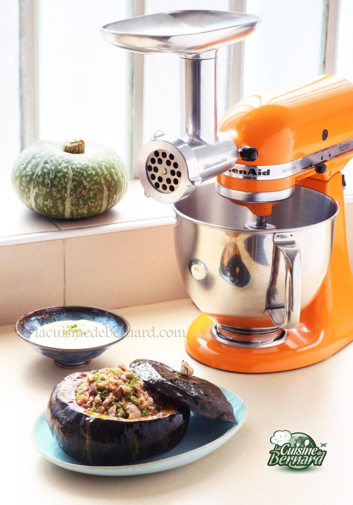 Kabocha farcie au poulet , châtaignes, noix et quinoa
