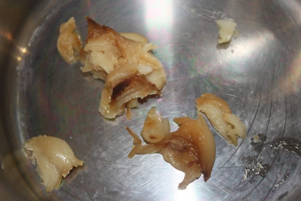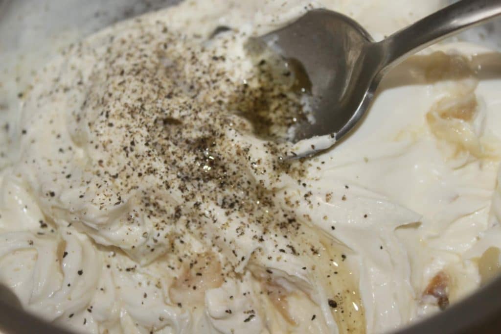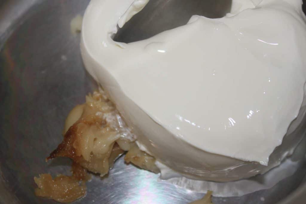 - Épluchez l’ail rôti et mettez la chair dans une casserole. Écrasez-la à la fourchette et ajoutez le mascarpone. Faites chauffer juste pour liquéfier le mascarpone.