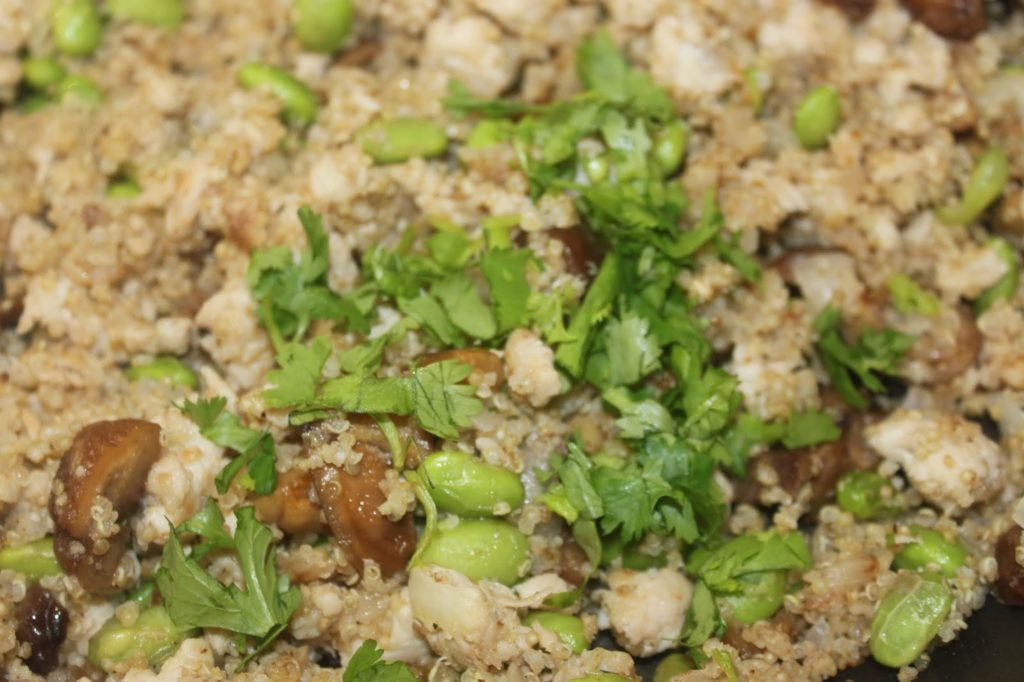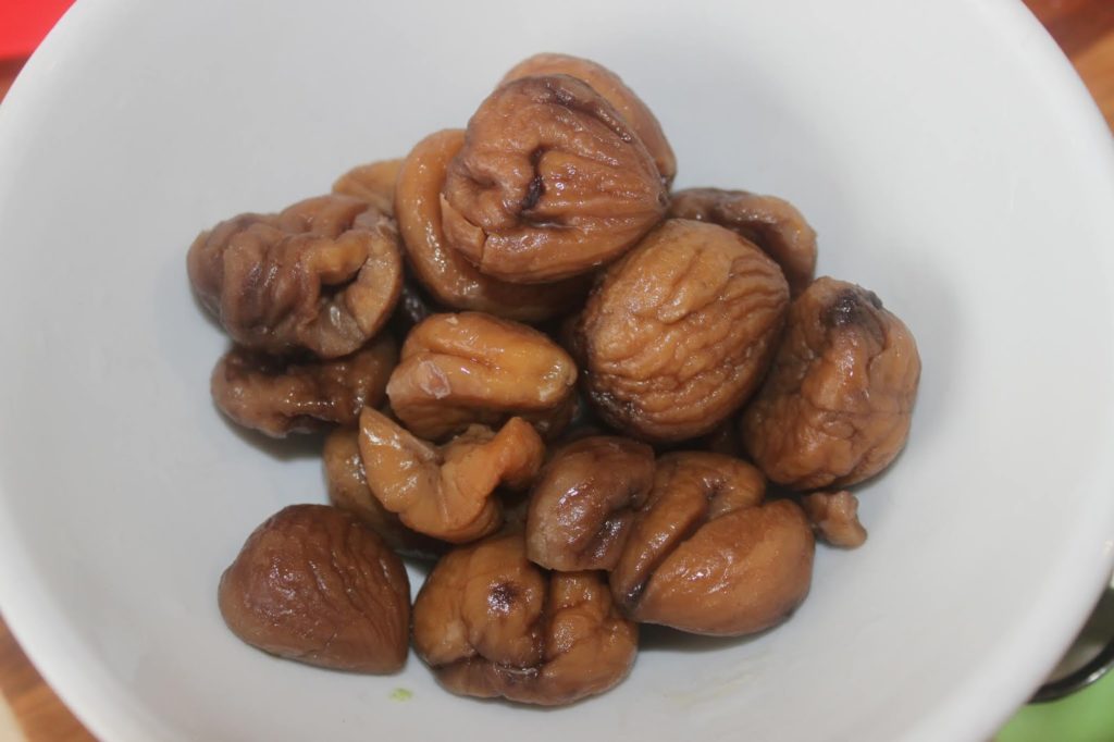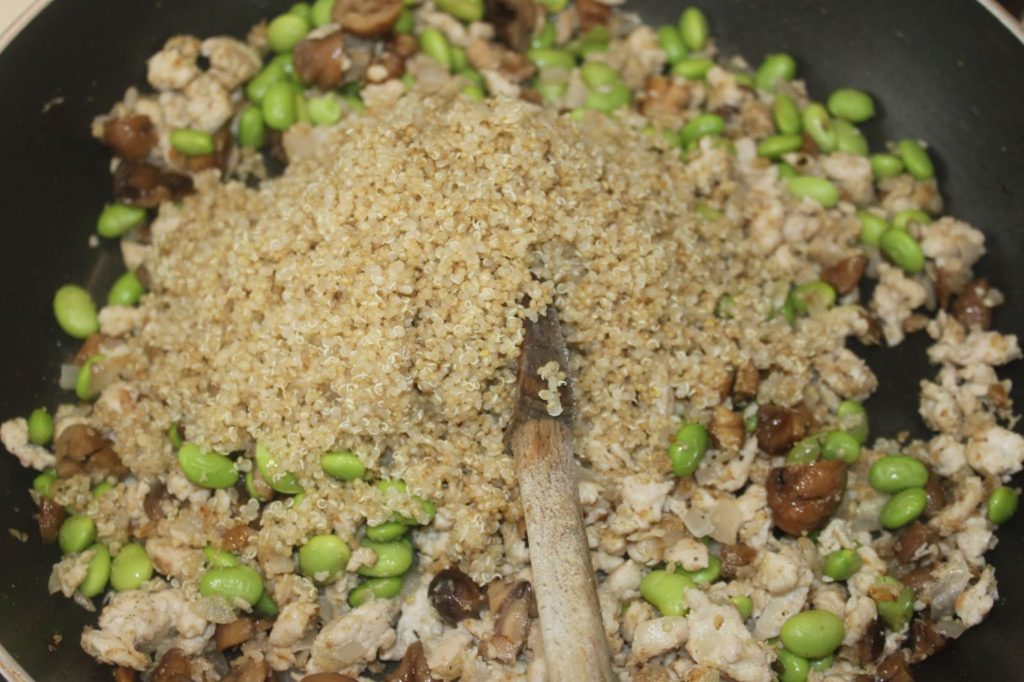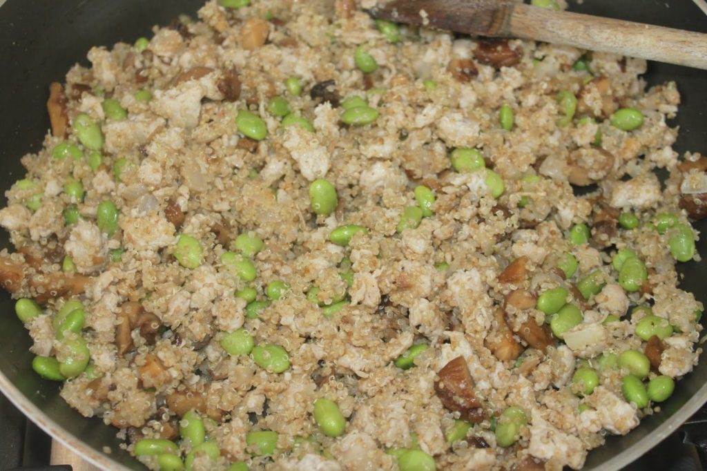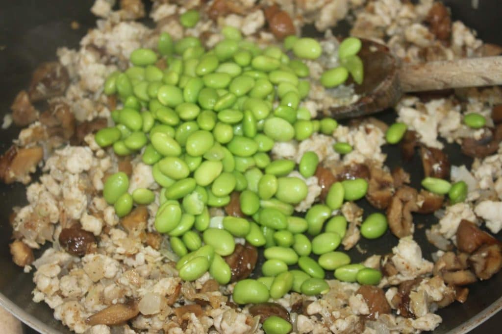 - Quand le poulet est bien cuit, ajoutez les châtaignes coupées en morceaux et les edamame (ou les fèves) cuits. Salez et poivrez à votre goût.