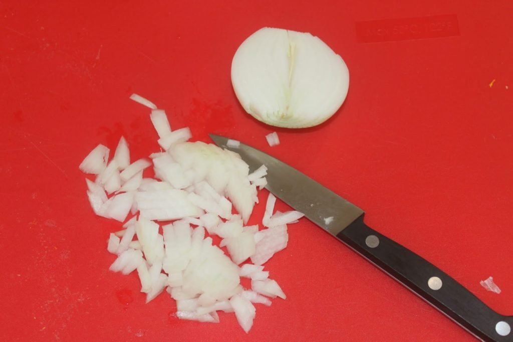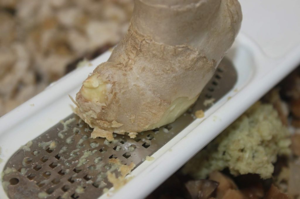 Épluchez et hachez finement l’oignon. Versez l’huile de noix (que vous pourrez remplacer par de l’huile d’olive) dans une grande poêle. Faites-la chauffer sur feu modéré et ajoutez-y l’oignon et le gingembre fraichement râpé. Faites cuire 5 minutes.