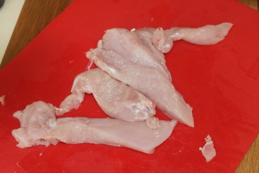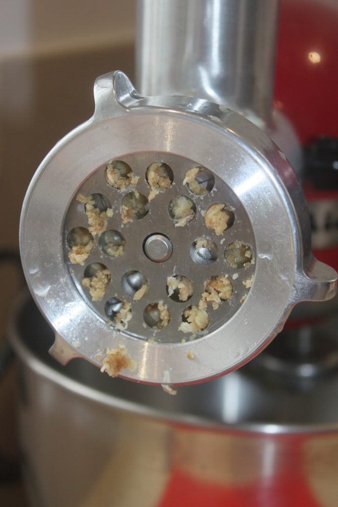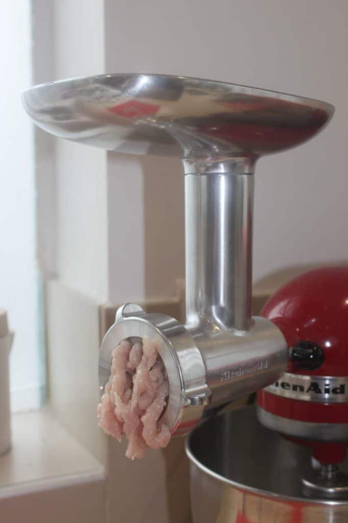 - Coupez le poulet en lanières épaisses puis passez-les dans le hachoir à viande Kitchenaid.