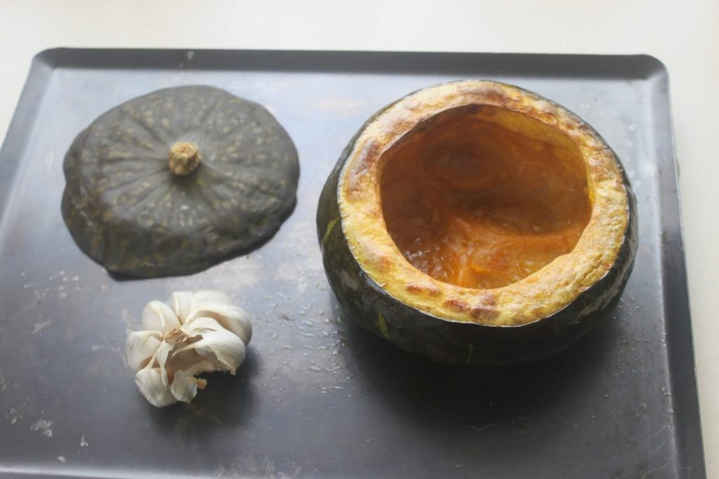 Faites tout d’abord cuire la courge kabocha. Vous pourrez la remplacer par n’importe quelle courge à chair ferme et sucrée.