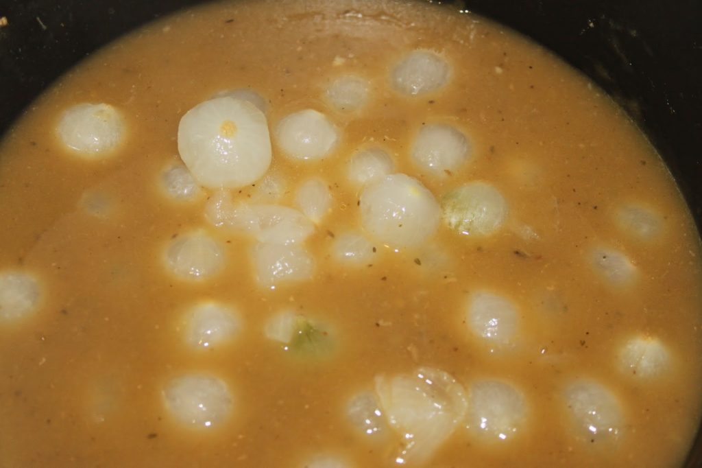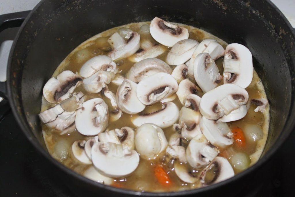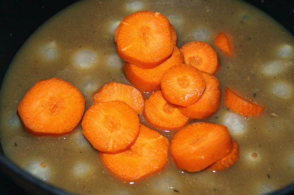 - Mettez à la place les oignons grelots et les carottes épluchées et coupées en rondelles. Pour les éplucher facilement, allez voir mes explications sur la daube ICI !