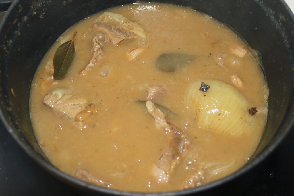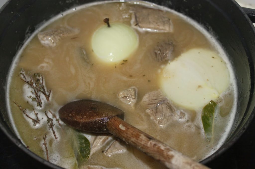 - Quand la viande est bien moelleuse, retirez-la du jus avec l’oignon, le laurier et le thym. Vous ne garderez ici que la viande.