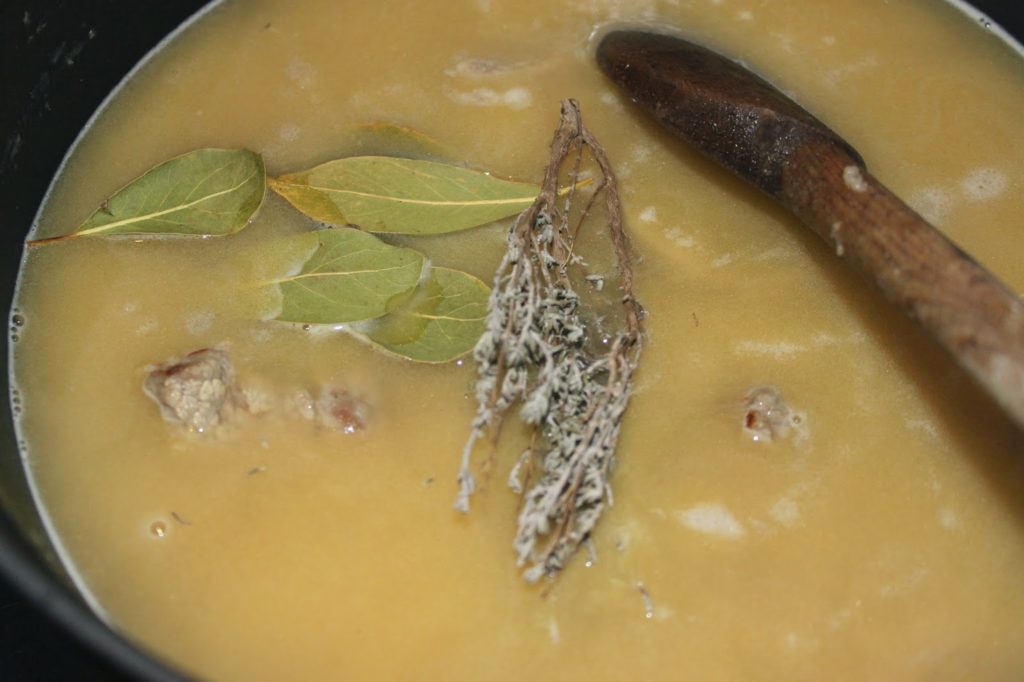- Placez les feuilles de laurier, les branches de thym et le cube de bouillon de veau.