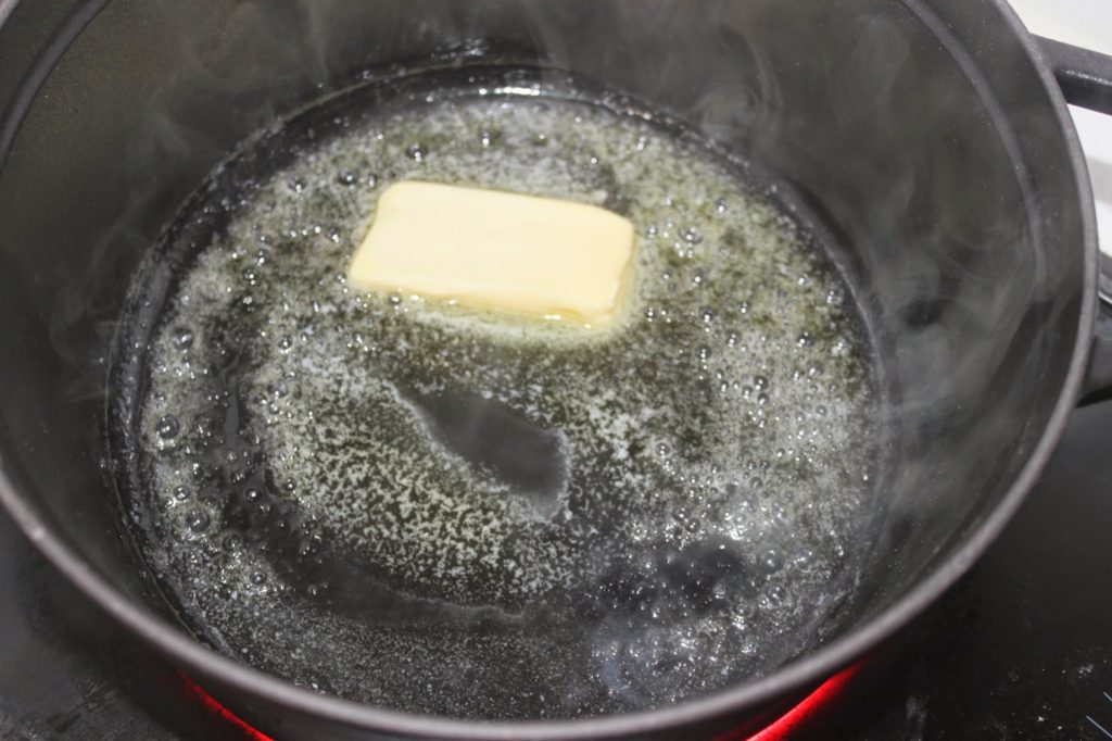 - Placez 40g de beurre (sur les 60) dans une cocotte sur feu assez fort.