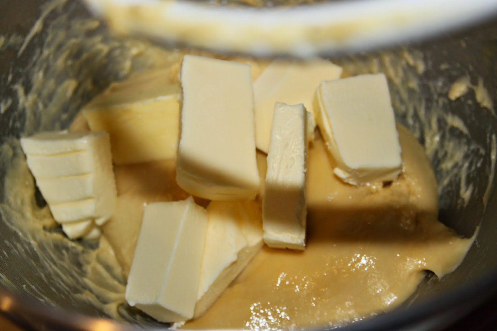 Ajoutez le beurre à température ambiante. Si vous avez oublié de le sortir du réfrigérateur avant, pas de panique !! Vous pouvez le mettre froid coupé en petits morceaux, il mettra juste plus de temps à s’incorporer.