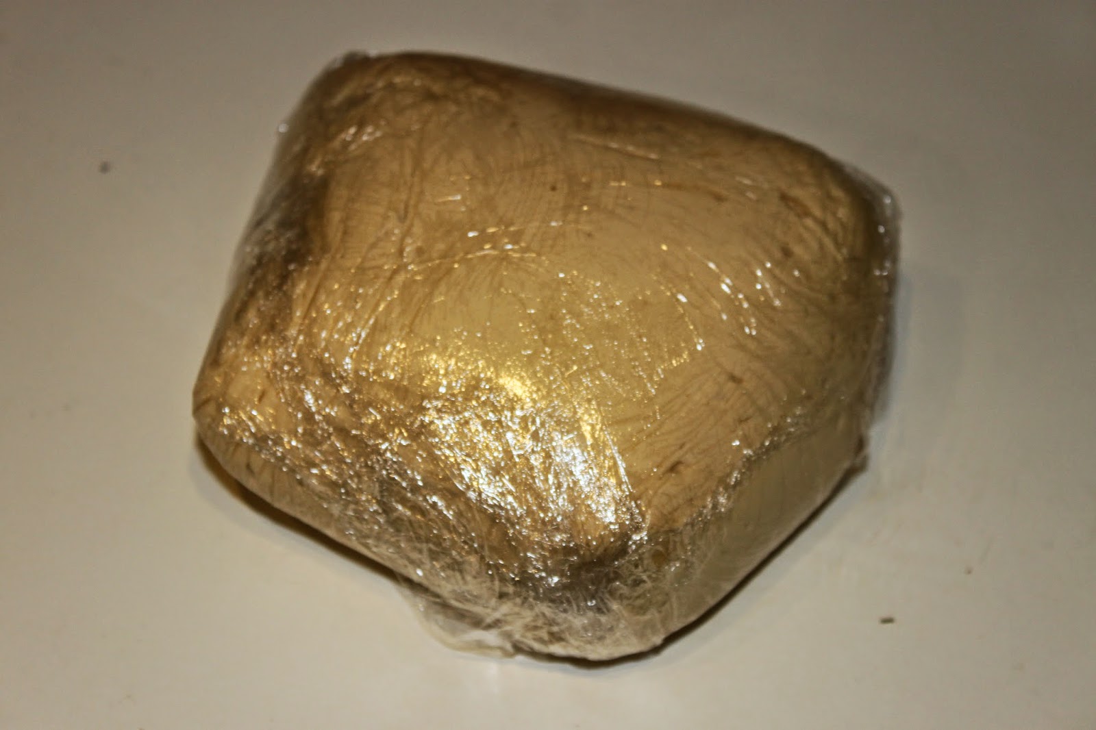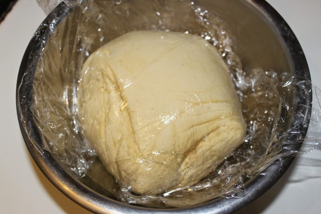 Après ce temps, appuyez dessus pour enlever l’air (la pâte colle un peu c’est normal) qu’elle contient puis emballez-la bien de film étirable. Placez ce paquet au réfrigérateur pour la nuit. Avant de la mettre au frais, la pâte n’est pas encore ferme, mais très souple et un peu collante. Ne pensez pas que c’est raté ! C’est normal. Il faudra peut être y aller avec une maryse pour l’emballer de film étirable.