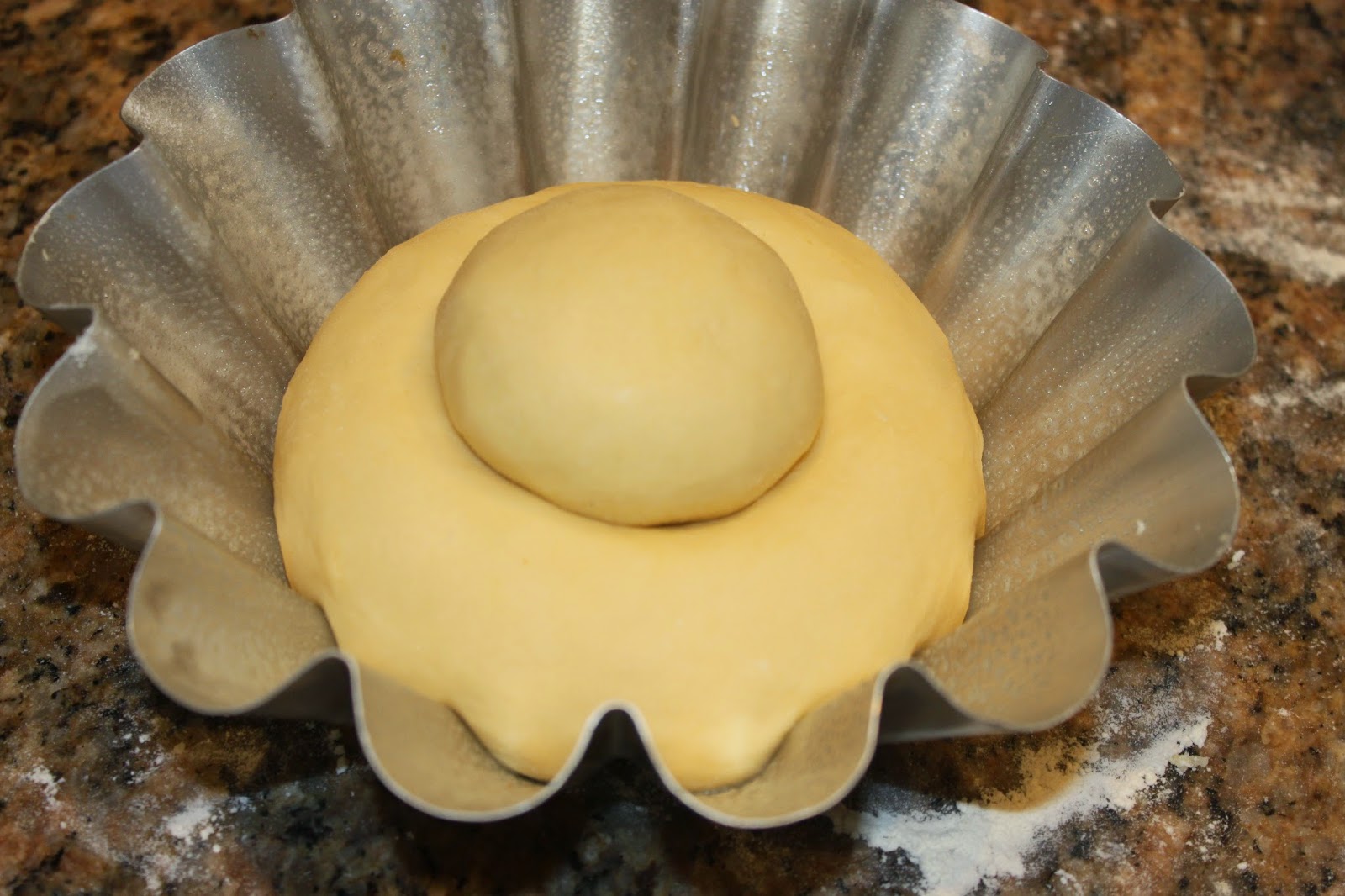Vaporisez de la bombe de démoulage dans votre moule à brioche. Vous pouvez aussi bien sûr y mettre du beurre. Placez la grosse boule de pâte dans le fond et appuyez au centre pour y faire une sorte de cavité. C’est en faisant cela que vous empêcherez la pâte de gonfler de travers. Avec une petite boule sur le dessus, la brioche tiendra en cuisson. Si vous mettez une boule trop grosse et sans cavité, la brioche poussera sur le côté et ressemblera à une vieille chaussette ! Elle sera quand même bonne !!