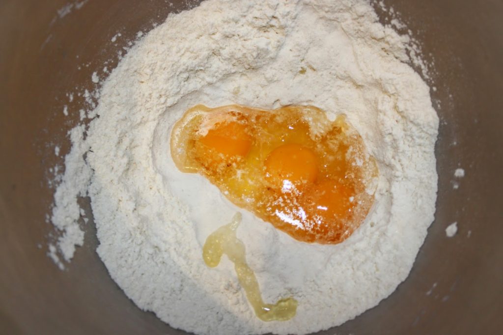 Ajoutez les 100g d’œuf. Cela fait en gros 2 œufs, mais sur la photo il y en a trois, n’en tenez pas compte !