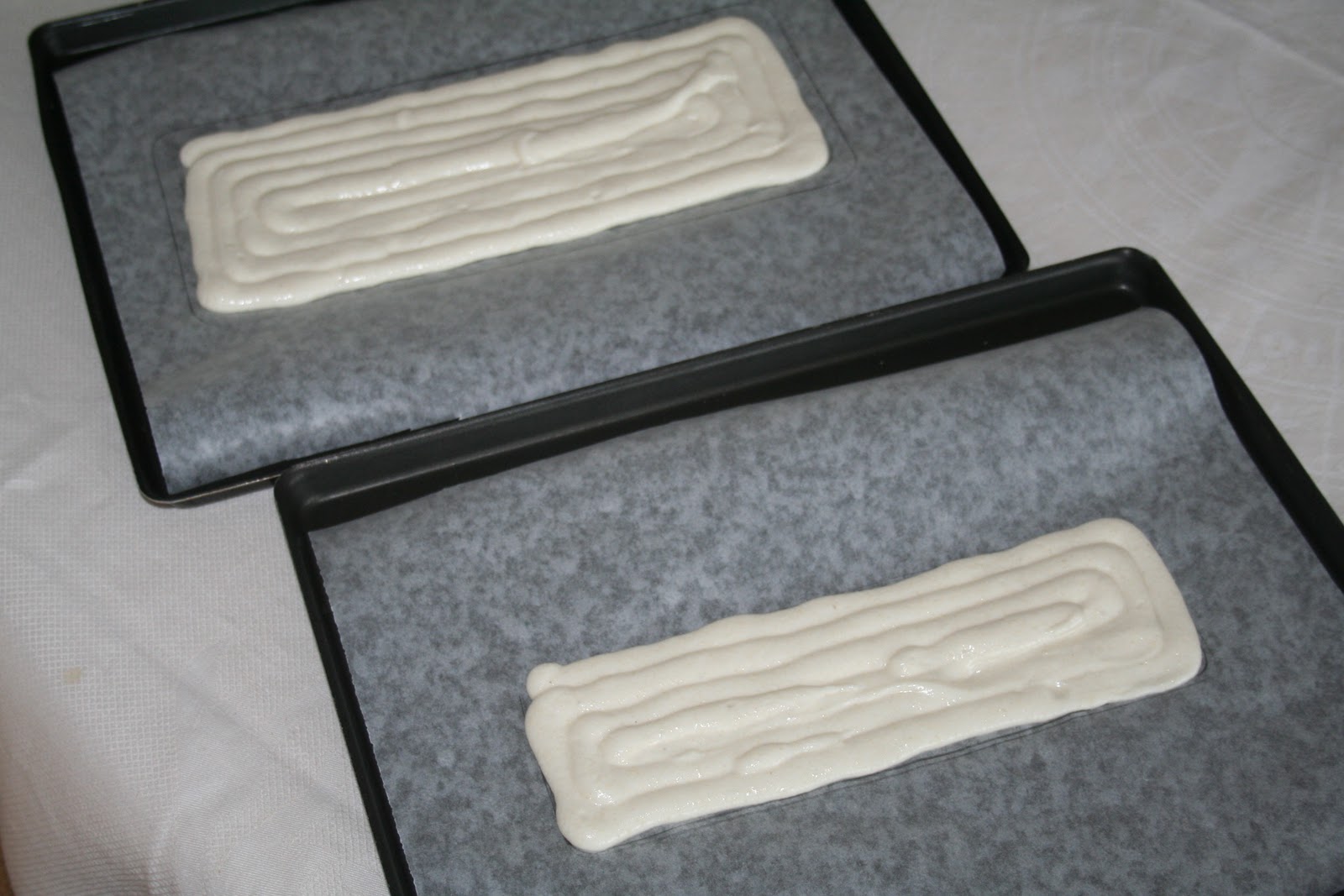 - On obtient alors deux plaques de tailles différentes, car elles iront à la base du gâteau pour l’une et au milieu pour l’autre. Comme le moule à cake n’est pas droit mais rétréci sur sa base, nous avons donc maintenant 2 plaques de macarons de bonnes tailles (deux!)!Laisser croûter avant de faire cuire. Il faut cuire les macarons de la même façon que d’habitude mais ajouter 3 minutes de cuisson pour les plaques de macarons.