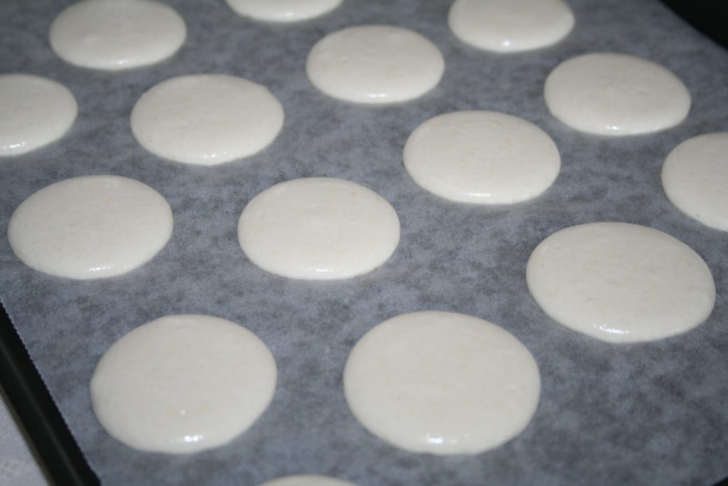 Mettre une couche de crème puis mettre la plus petite plaque de macaron (la mettre à l’envers).