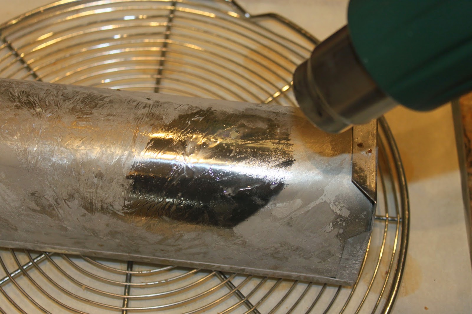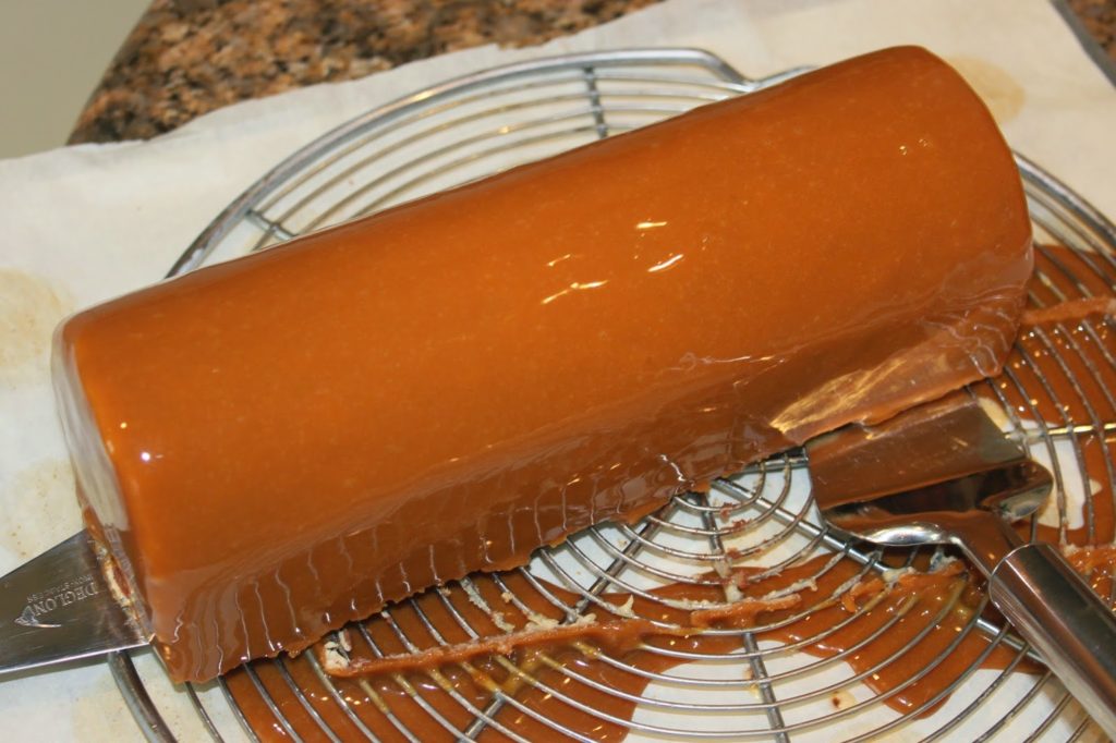 - Démoulez la bûche (quand le caramel est prêt: 28-29°C) avec un sèche-cheveux (ou même un décapeur thermique que j’utilise ici) sur une grille à pâtisserie.