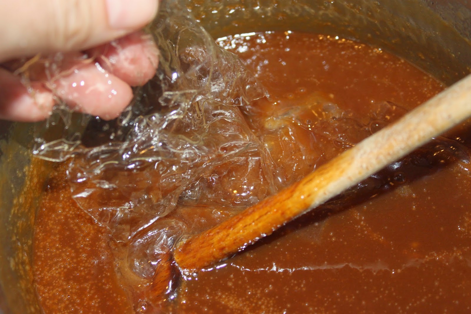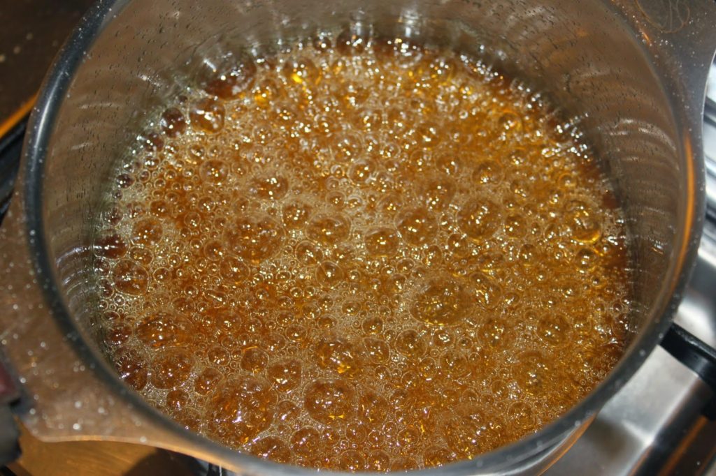 - Ajoutez les feuilles de gélatine que vous aurez essorées. Mélangez bien pour répartir la gélatine uniformément dans le caramel. Laissez maintenant refroidir jusqu’à 28-29°C en mélangeant de temps en temps.