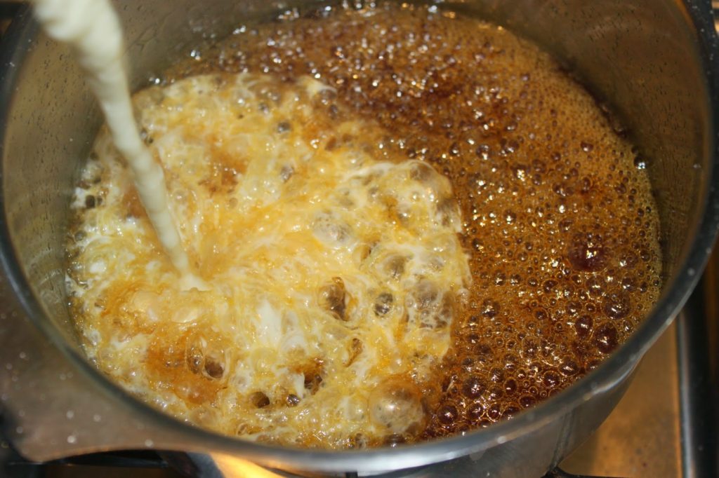 - Hors du feu, versez la crème liquide entière petit à petit (que vous aurez réchauffée pour éviter des projections !). Vous pouvez mélanger cette fois !