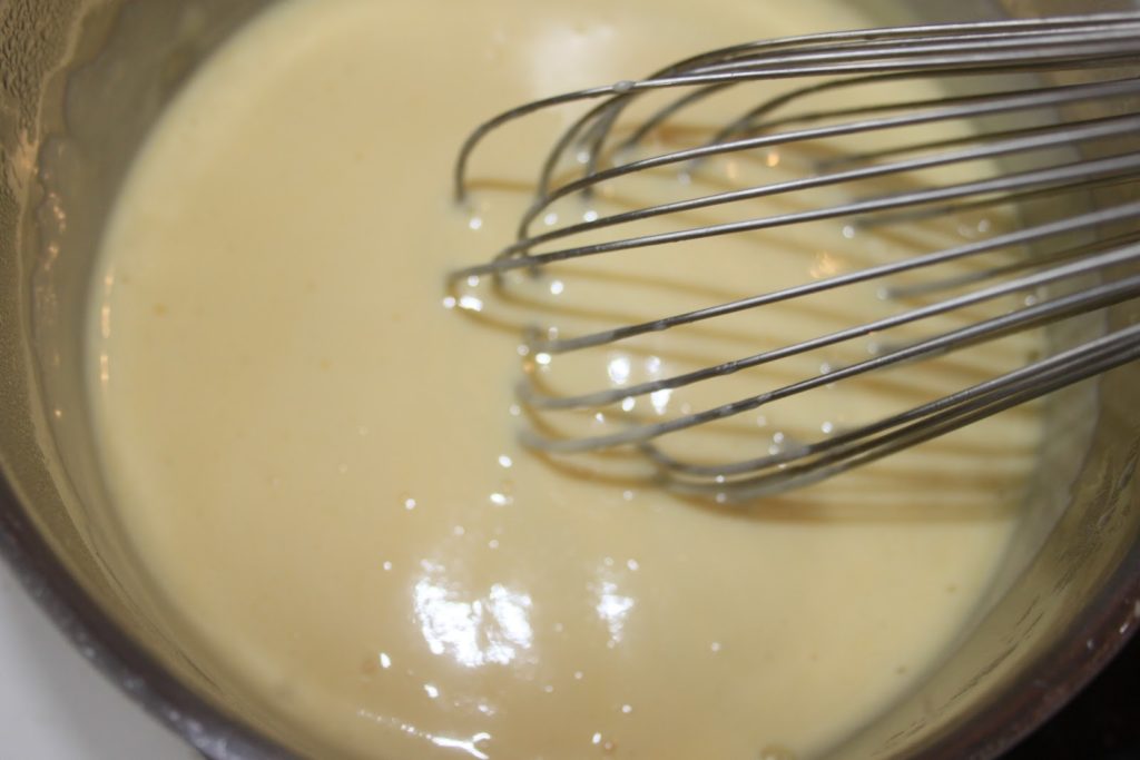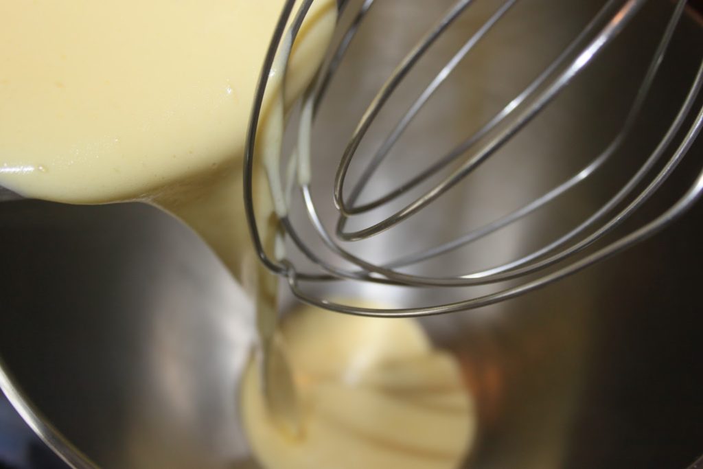 - Remettez sur feu doux et faites cuire comme une crème anglaise, c’est à dire sans bouillir. On peut vérifier en cuisant jusqu’à 85°C tout en mélangeant ! Je fouette continuellement la crème pendant sa cuisson pour la rendre aérée et onctueuse.