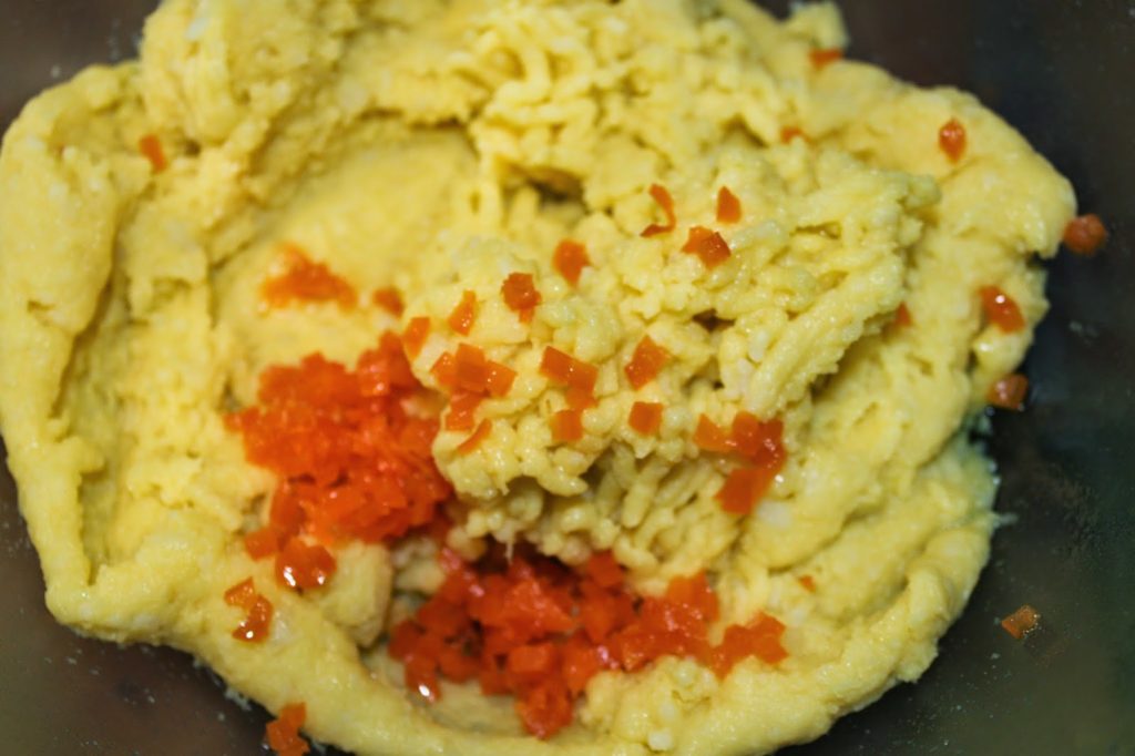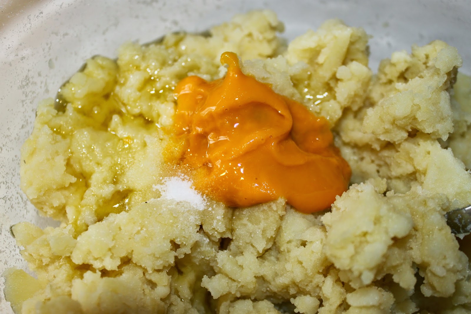 - Écrasez les pommes de terre avec la crème de « aji amarillo », l’huile d’olive et du sel.