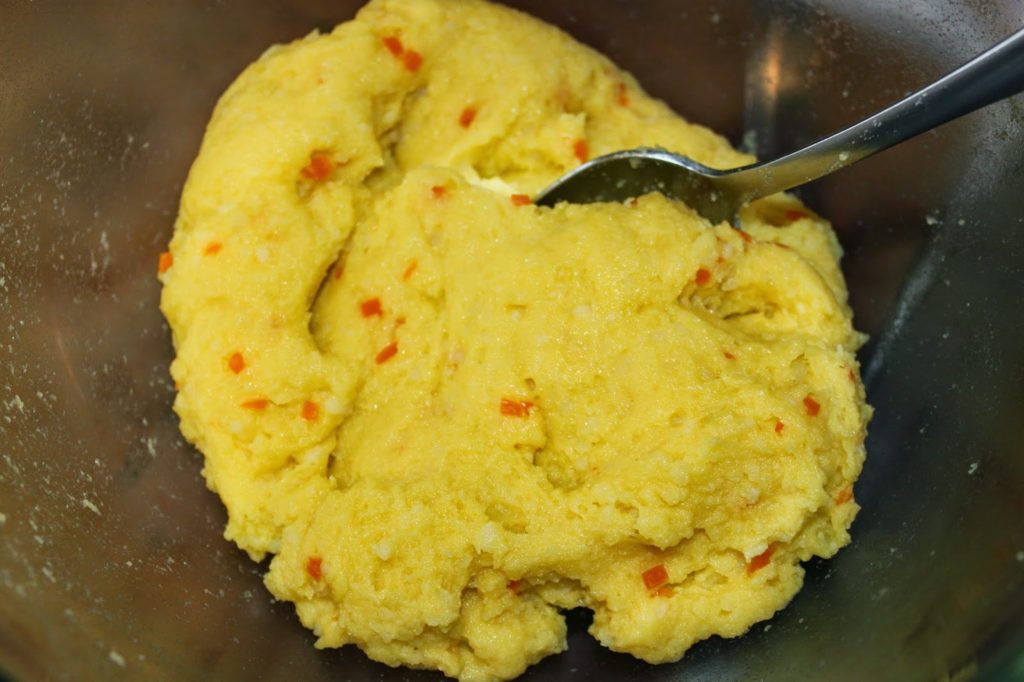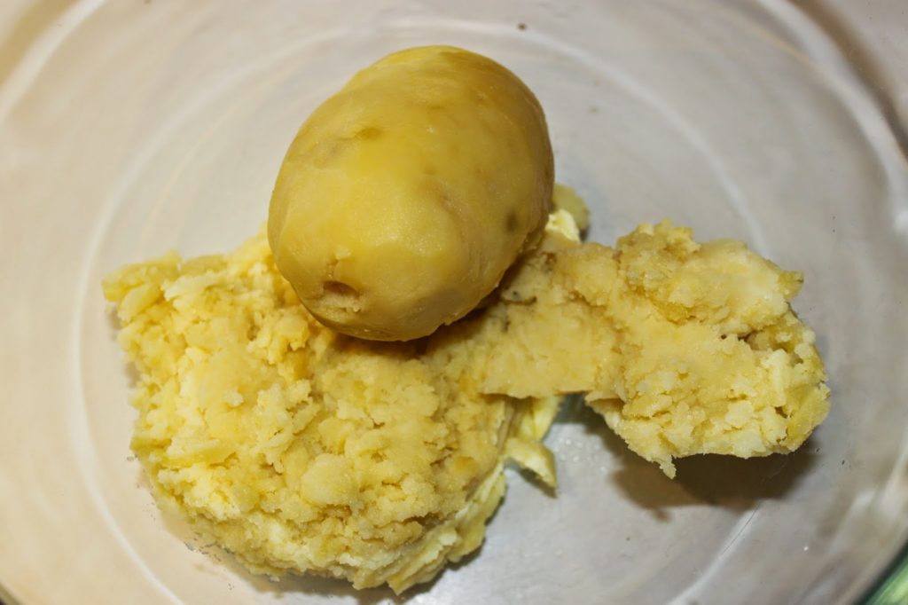 - Faites cuire vos pommes de terre à la vapeur. Laissez-les refroidir, puis épluchez-les. Au Pérou, ils prennent des « papas amarillas », presque impossible à trouver chez nous. La bintje convient parfaitement. J’ai fait la recette avec en gros 650g de chair cuite et épluchée. Écrasez les pommes de terre.