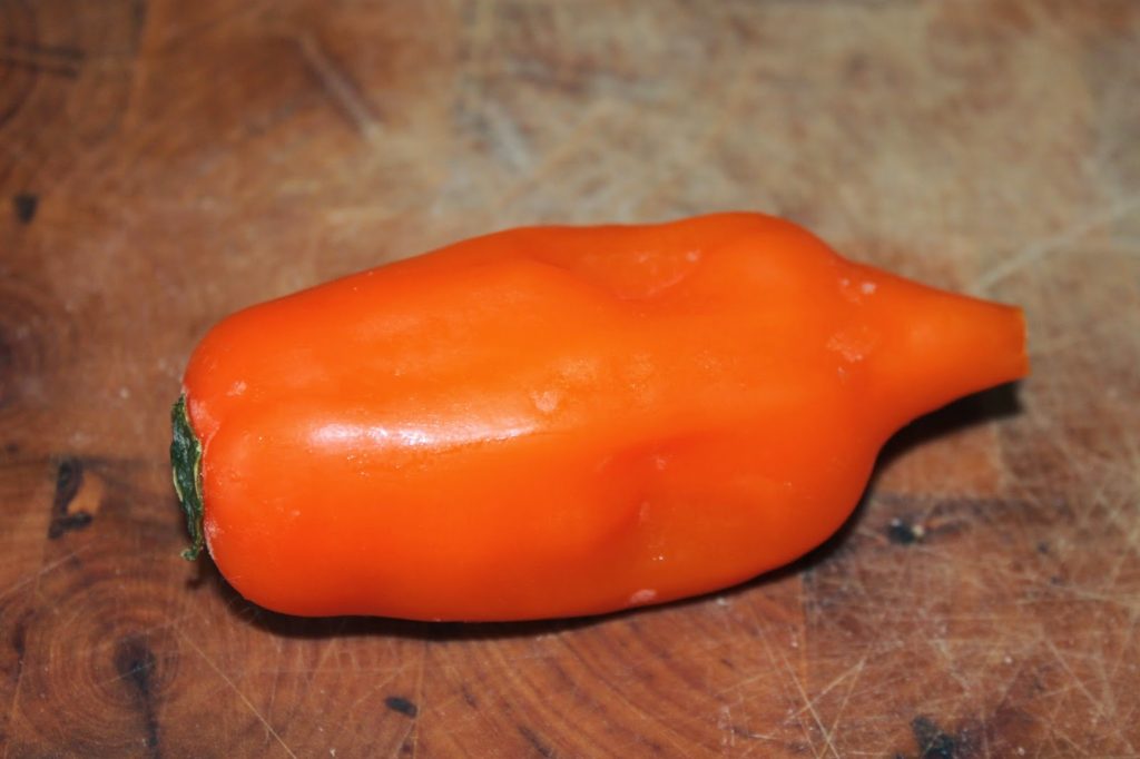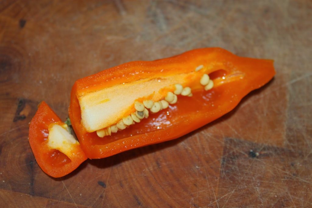 - Dans tous les cas, coupez le aji en deux et ôtez les graines. Pour vos donner une idée de la taille de ce piment, celui-là faisait en gros 8-9cm. Donc un petit quart de poivron orange.