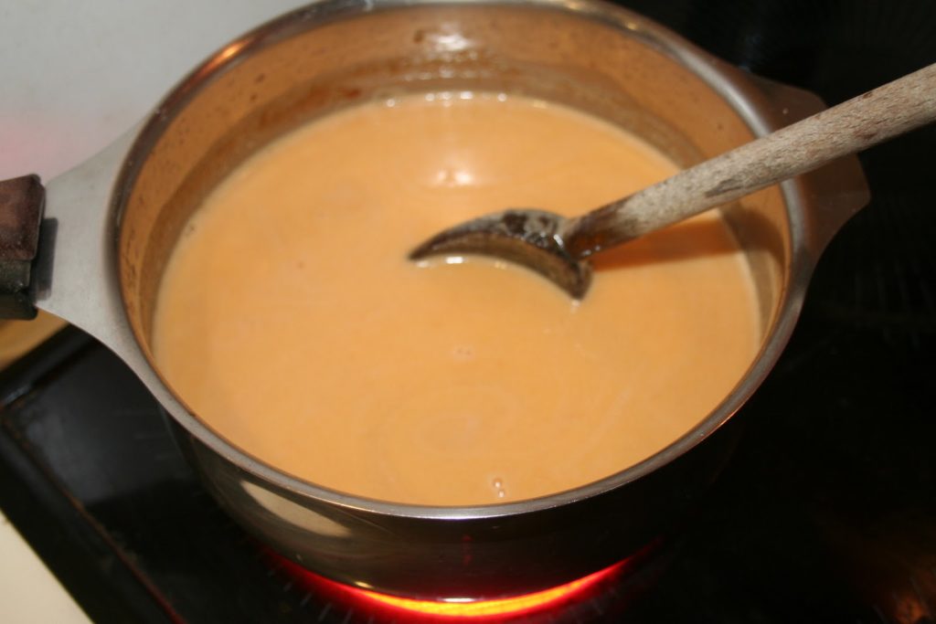 - Puis remettre le tout sur feu doux. Cuire comme pour une crème anglaise en portant le tout à 86°C.
