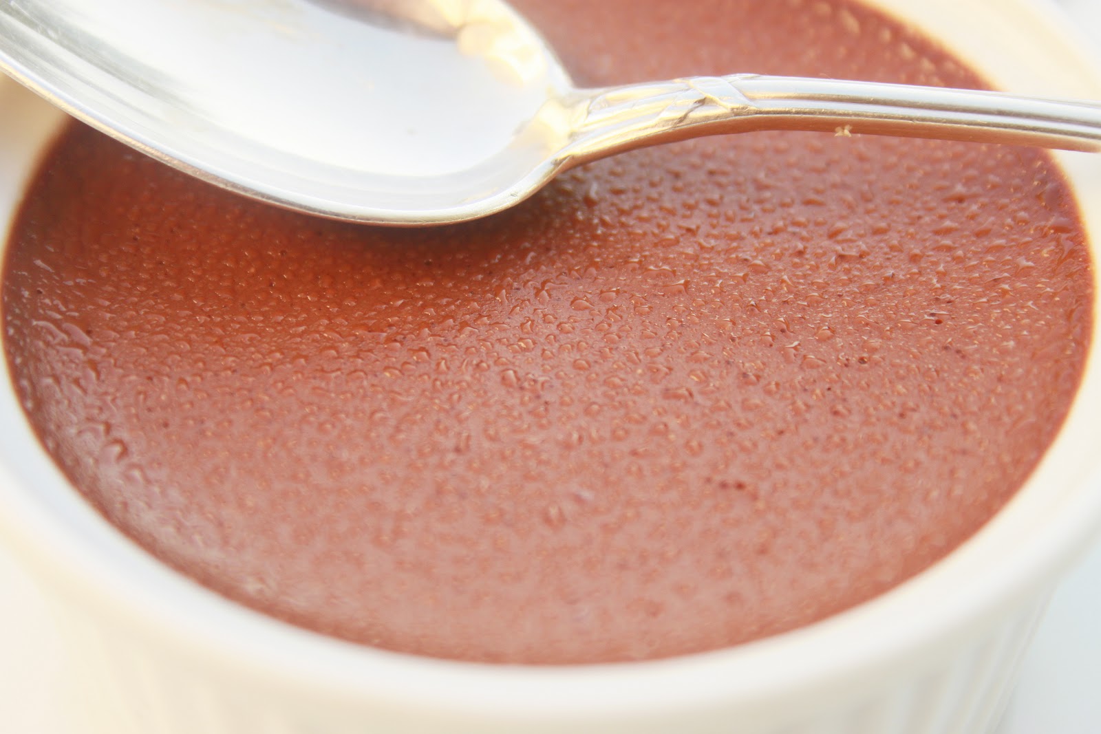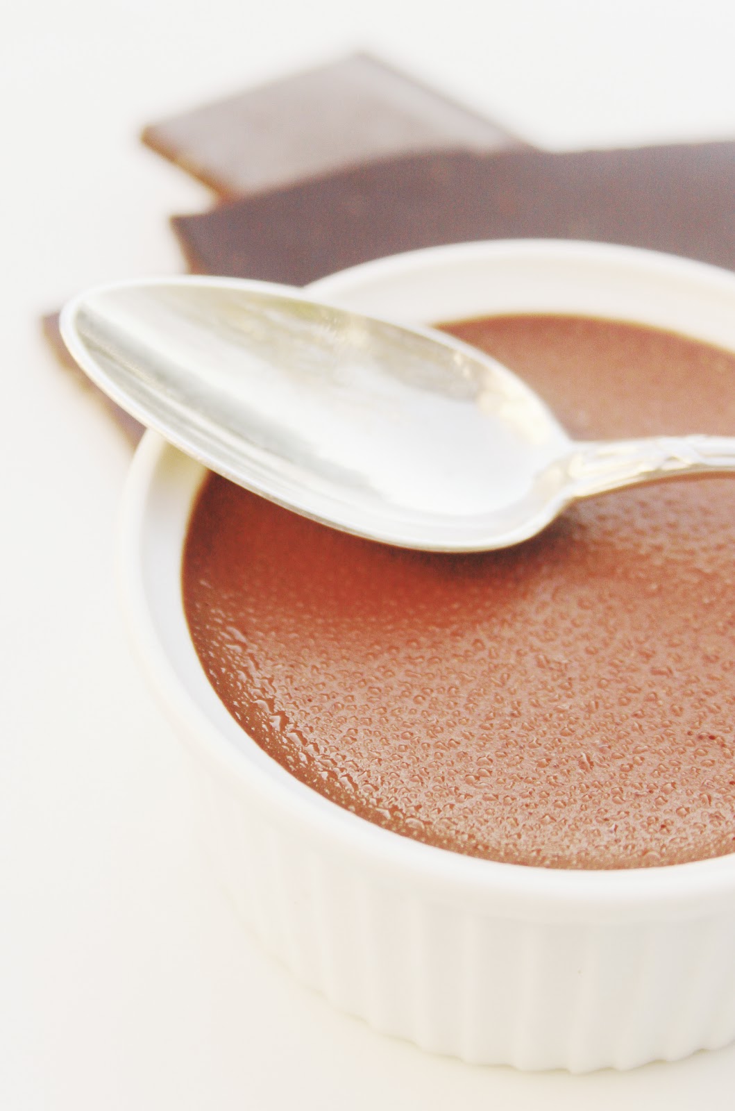 Lors d’un de mes cours de cuisine à domicile, Valérie, une des élèves, m’a très gentiment invité à déjeuner avec elles avant de préparer ensemble des macarons. À la fin du repas, elle nous apporta des crèmes au chocolat. Au moment où j’ai plongé la cuiller dans le pot, j’ai tout de suite compris qu’il allait me falloir cette recette. En effet, la crème est ferme juste comme il faut et fondante en bouche, avec un goût riche et rassurant de chocolat cuit. Cette recette est absolument divine et tout est dans les proportions, de plus, il va vous falloir moins de 5 minutes pour la préparer (il faut ensuite la laisser refrodir!). Je remercie encore Valérie de partager avec nous cette fabuleuse crème au chocolat, riche et onctueuse.