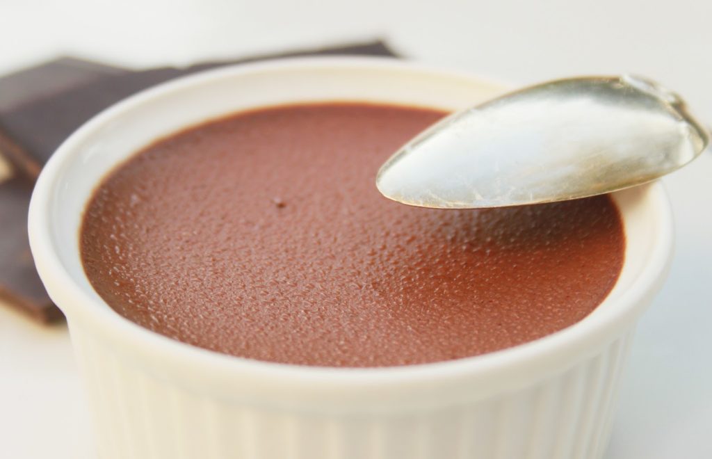Lors d’un de mes cours de cuisine à domicile, Valérie, une des élèves, m’a très gentiment invité à déjeuner avec elles avant de préparer ensemble des macarons. À la fin du repas, elle nous apporta des crèmes au chocolat. Au moment où j’ai plongé la cuiller dans le pot, j’ai tout de suite compris qu’il allait me falloir cette recette. En effet, la crème est ferme juste comme il faut et fondante en bouche, avec un goût riche et rassurant de chocolat cuit. Cette recette est absolument divine et tout est dans les proportions, de plus, il va vous falloir moins de 5 minutes pour la préparer (il faut ensuite la laisser refroidir!). Je remercie encore Valérie de partager avec nous cette fabuleuse crème au chocolat, riche et onctueuse.
