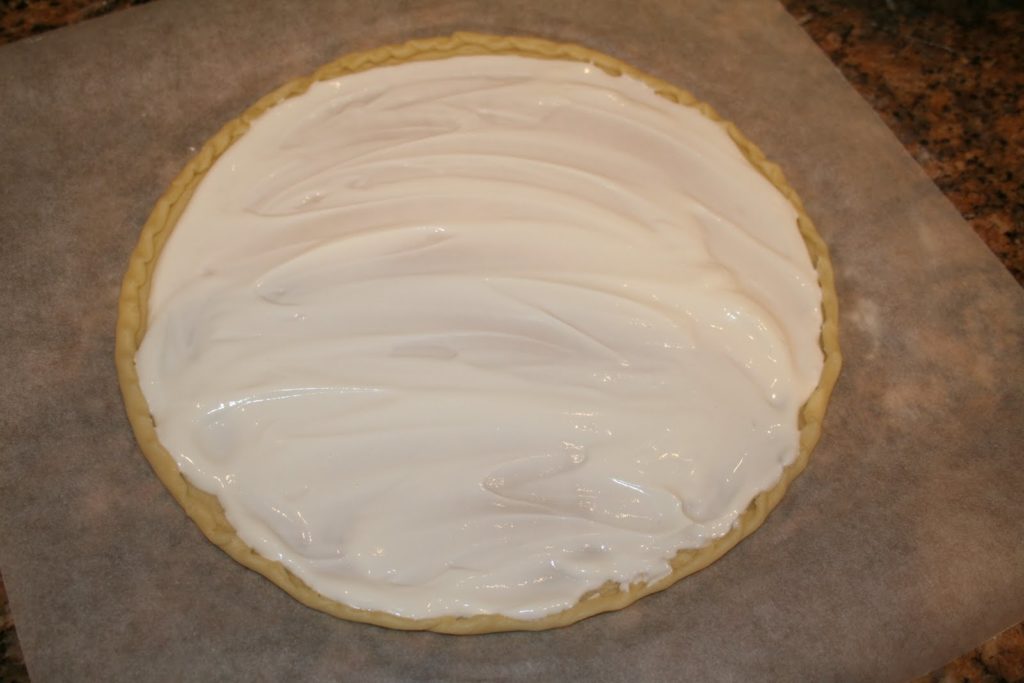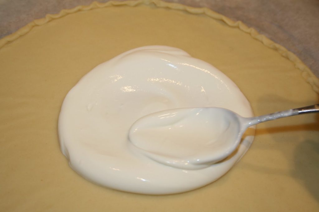 - Mélanger dans un bol la crème entière et le fromage blanc et étaler deux cuillerées à soupe de ce mélange sur la pâte.