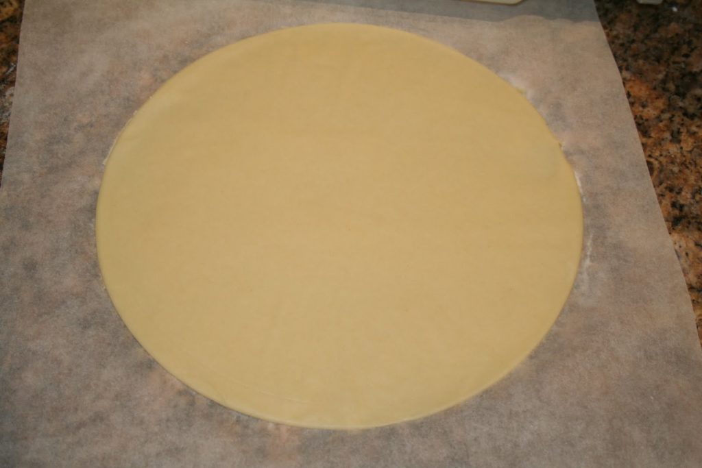 - Avec un cercle à gâteau, couper un cercle de pâte. On peut couper simplement au couteau en essayant au mieux de faire un beau cercle!