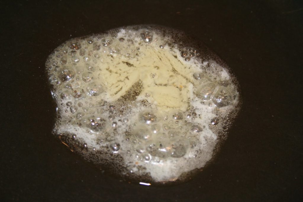 Donc mettre une noix de beurre et une petite cuillerée d’huile dans une poêle et chauffer à feu doux.