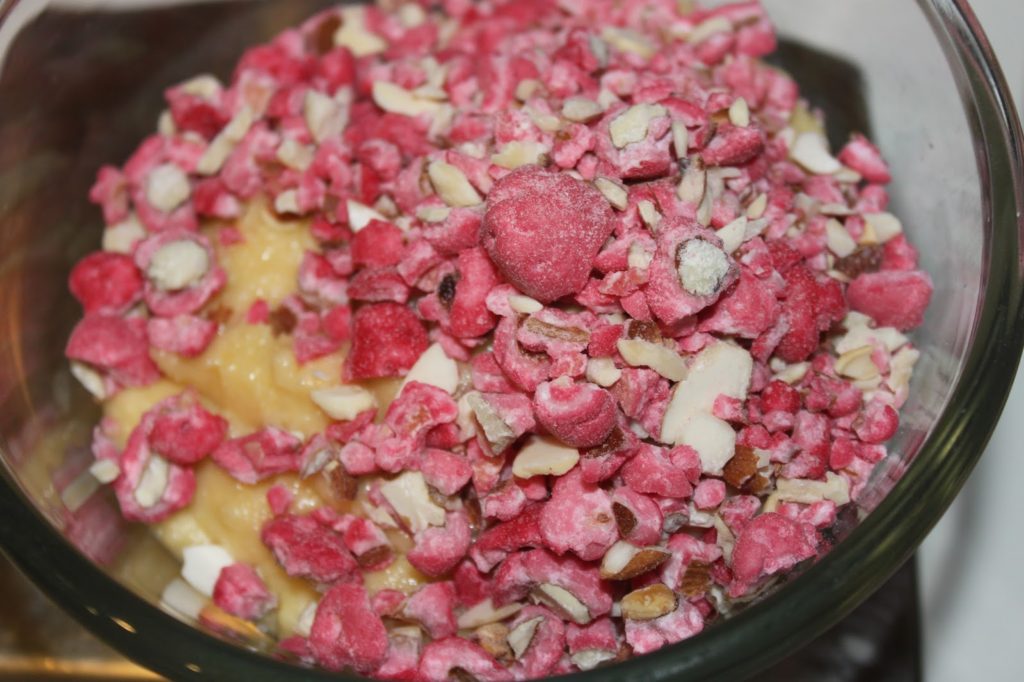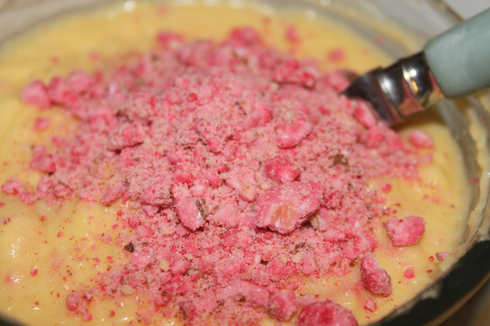 - Mélangez puis ajoutez la moitié des pralines roses grossièrement hachées. Vus pouvez les trouver dans le commerce ou les faire vous-même avec ma recette ICI !