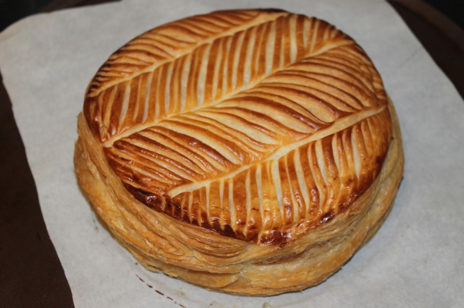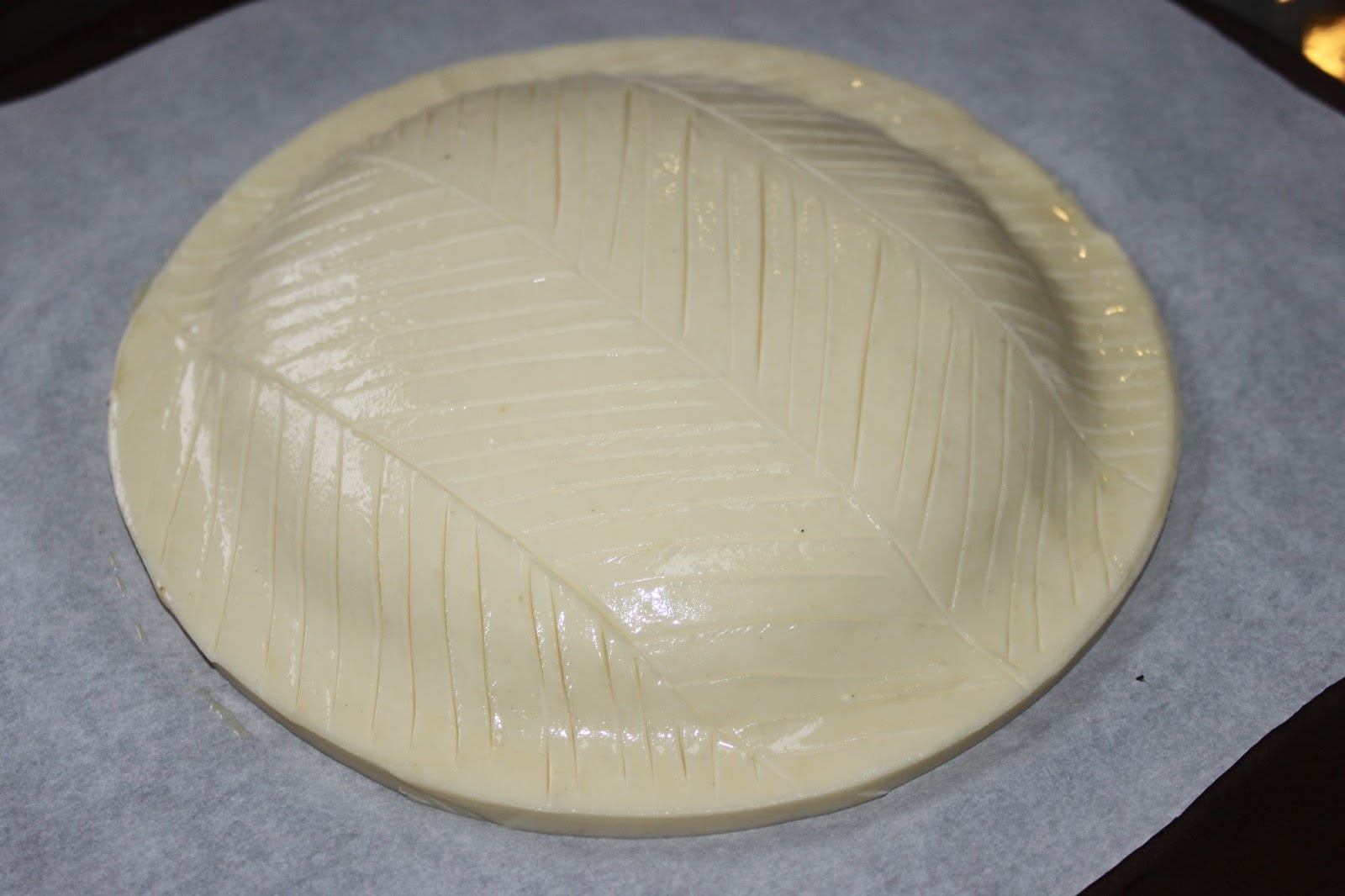 Le jour de la cuisson. Étalez votre pâte feuilletée légèrement farinée sur du papier sulfurisé. Cela est plus facile pour travailler. Choisissez la taille de votre galette. J’en ai fait une assez petite (il y a de quoi faire 2 grandes avec les proportions que je vous ai données).