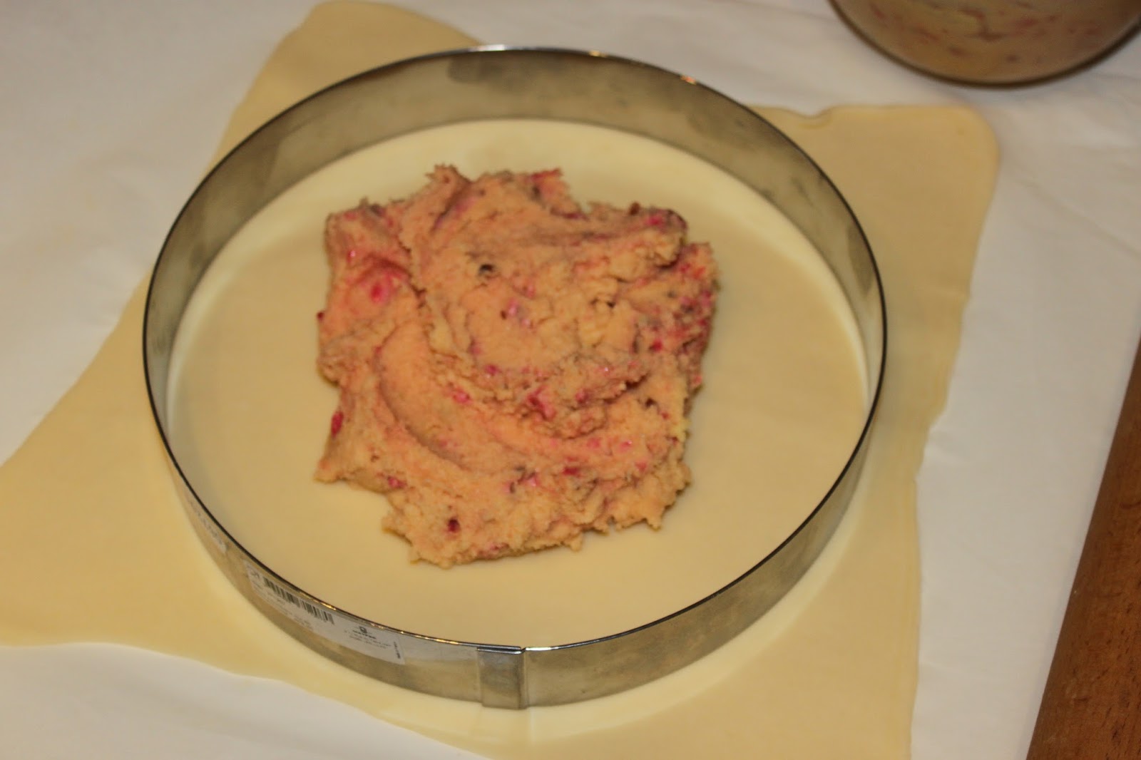 Posez le cercle sur la pâte, d’une part pour vérifier la bonne taille de l’étalage et pour centrer la crème aux pralines roses.
