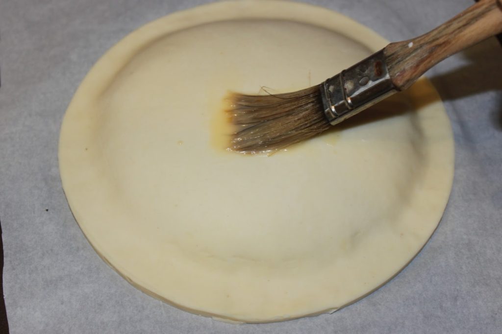- Mettez une bonne quantité. Vous pouvez maintenant ôter le cercle. Imbibez la pâte légèrement d’eau tiède au pinceau.