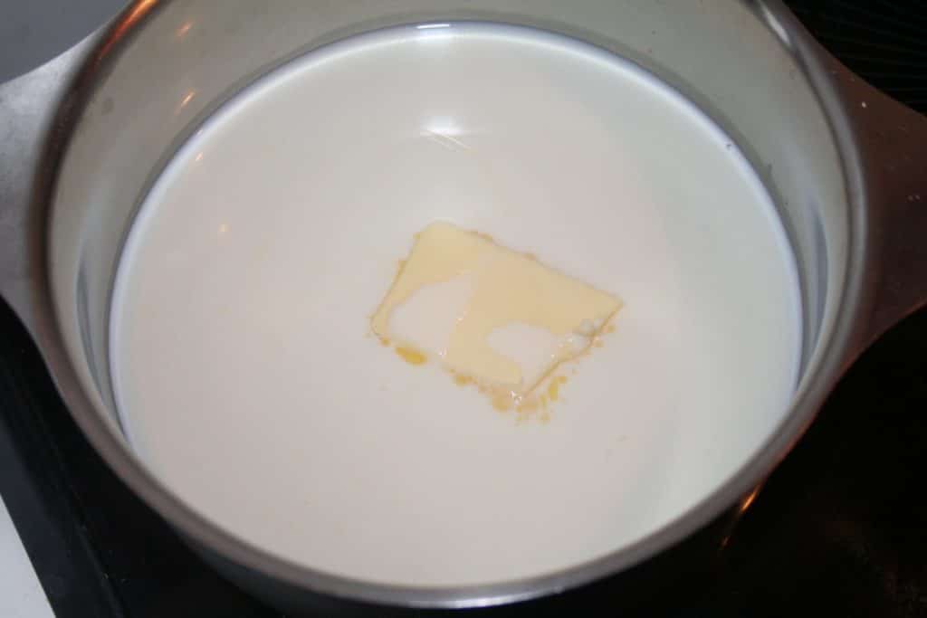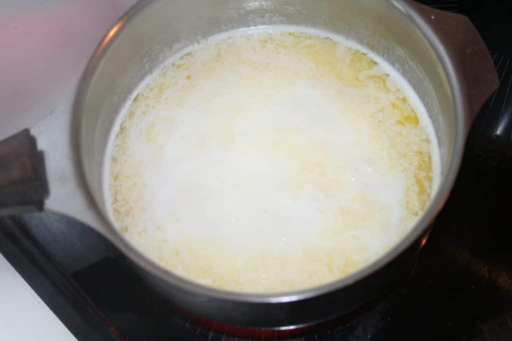- Faites bouillir le lait avec l’autre moitié du sucre et le beurre.