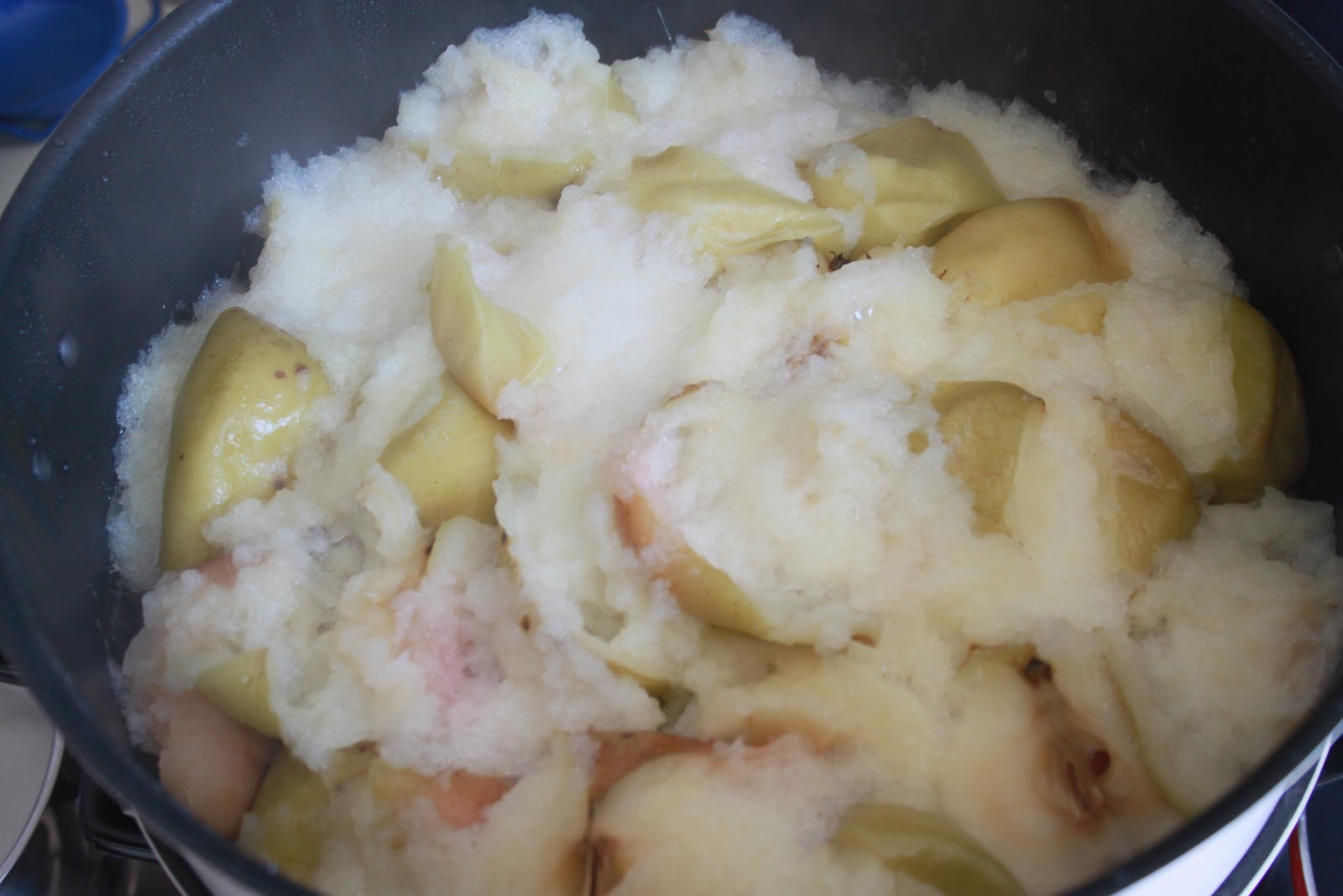 Puis ajouter le même poids de sucre. On peut également ajouter le jus d’un citron pour plus de pectine naturelle.