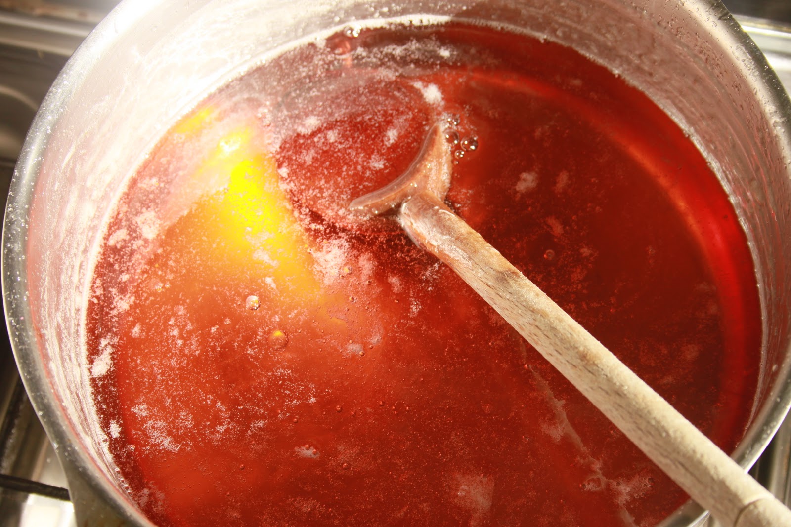 Dans le cas d’une utilisation du sucre sans pectine (ce qui est le cas ici):Il faut écumer au besoin, et laisser cuire pendant presque trente minutes. Il faut faire le test de la goutte refroidie pour voir si la gelée prend. Il faut verser un peu de jus sur une assiette froide, la mettre au frais 2 minutes et vérifier la consistance de la gelée. Conseil de Bernard: je préfère la cuisson avec un sucre classique, ce qui est plus long à préparer et sans doute plus laborieux, mais la couleur que l’on obtient n’a rien à voir avec une sucre gélifiant. Pourquoi? Car le sucre gélifiant va cuire 8 minutes, alors qu’avec un sucre classique, on doit cuire plus longtemps, ce qui évapore plus d’eau et concentre le goût et la couleur!