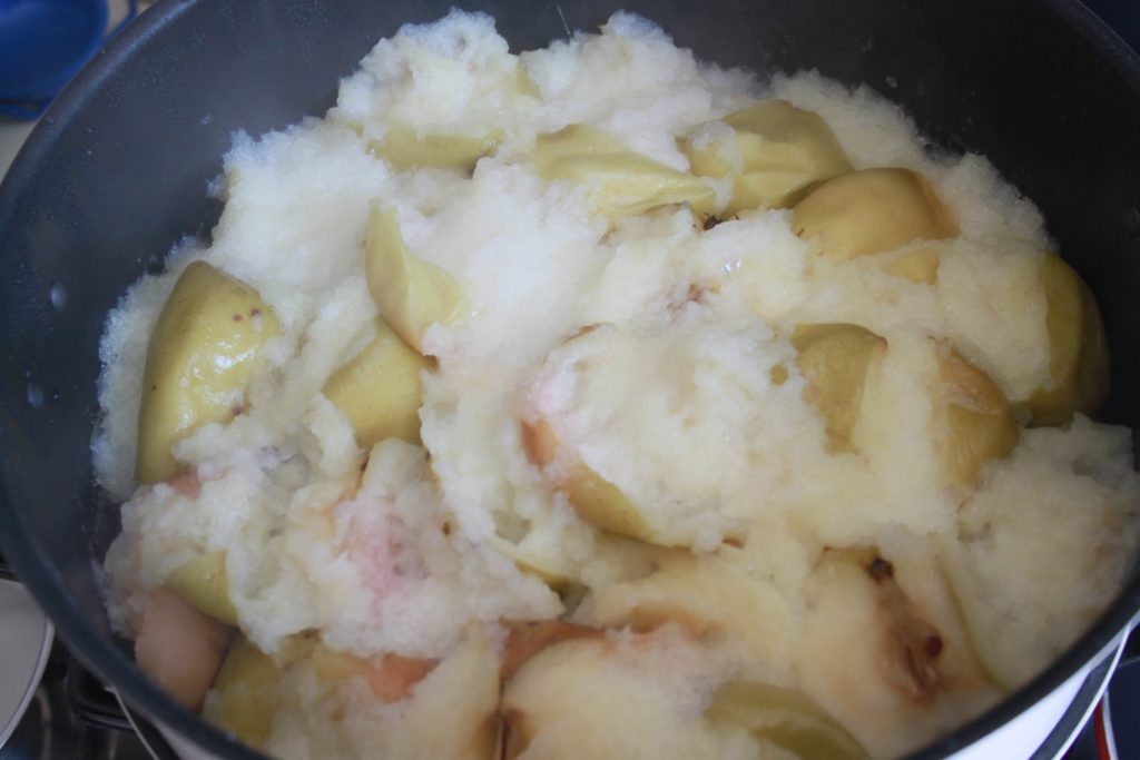 Mettre l’extracteur sur le feu et laisser bouillir pendant une bonne heure. Les pommes doivent avoir explosé et être réduites en purée. On peut éteindre le feu et laisser reposer encore 15 minutes pour recueillir le plus de jus possible.