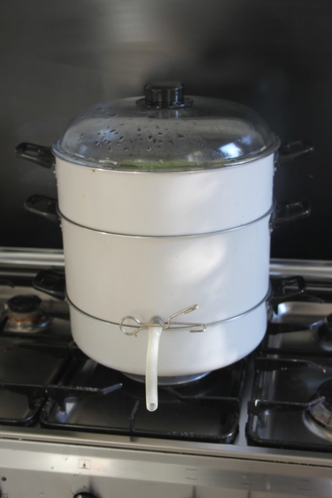 Voici l’extracteur de jus. Il y a trois compartiments. Celui du bas contient l’eau en ébullition, celui du haut les fruits, et celui du milieu récupère le jus des fruits cuits par la vapeur. On peut se passer de cet outil et cuire des pommes et récupérer le jus en pressant dans un torchon, mais je trouve l’extracteur beaucoup plus confortable d’utilisation.