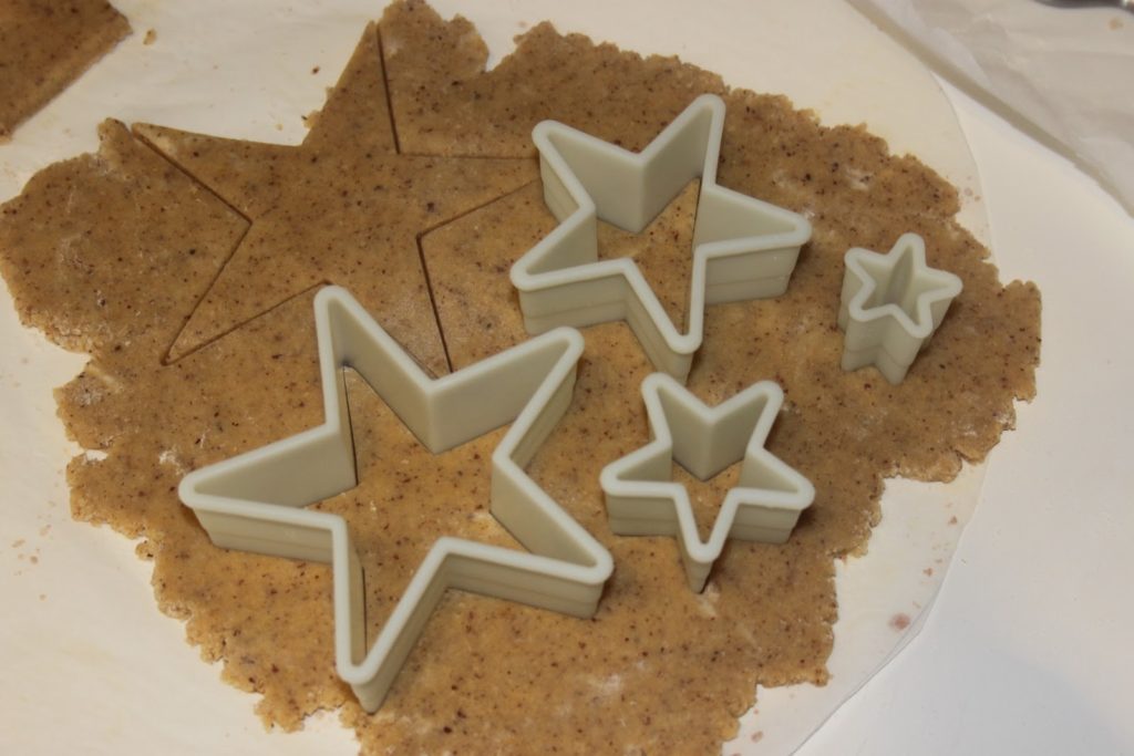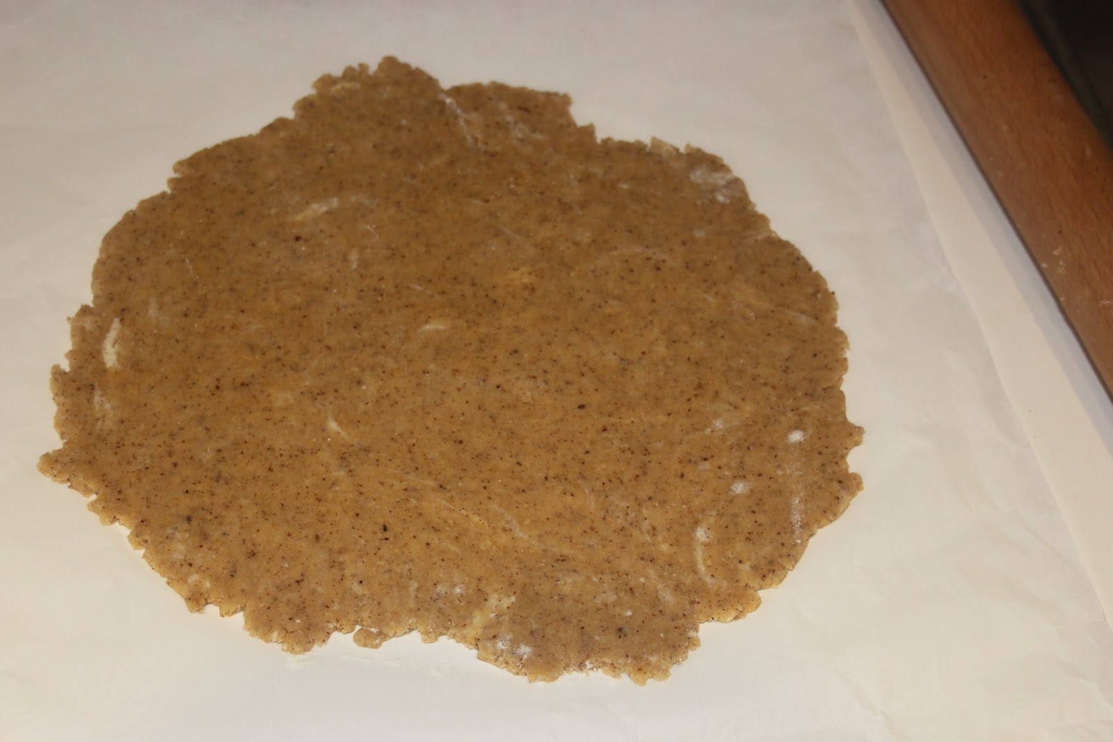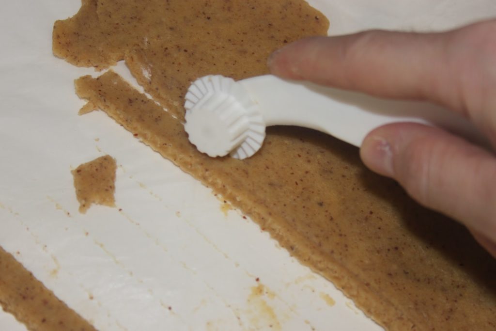 - Étaler sur une feuille de papier sulfurisé sur une épaisseur de 2mm. La pâte ne gonflera que très peu, car il n’y a pas de blancs et juste un soupçon de levure chimique.
