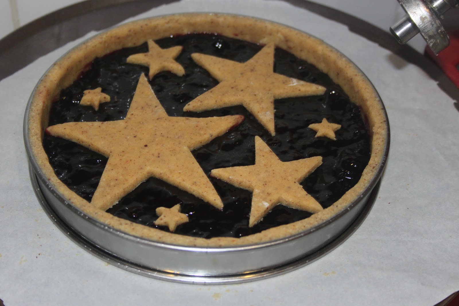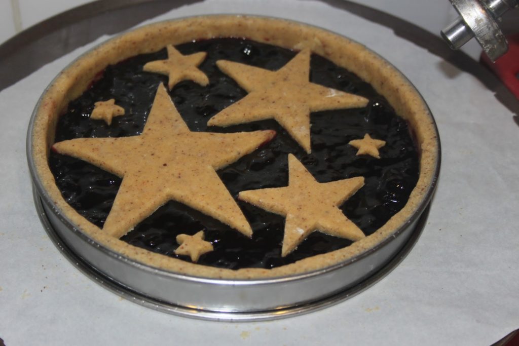- Avec le reste de pâte, couper des bandes ou des étoiles pour réaliser cette Linzertorte de Noël !