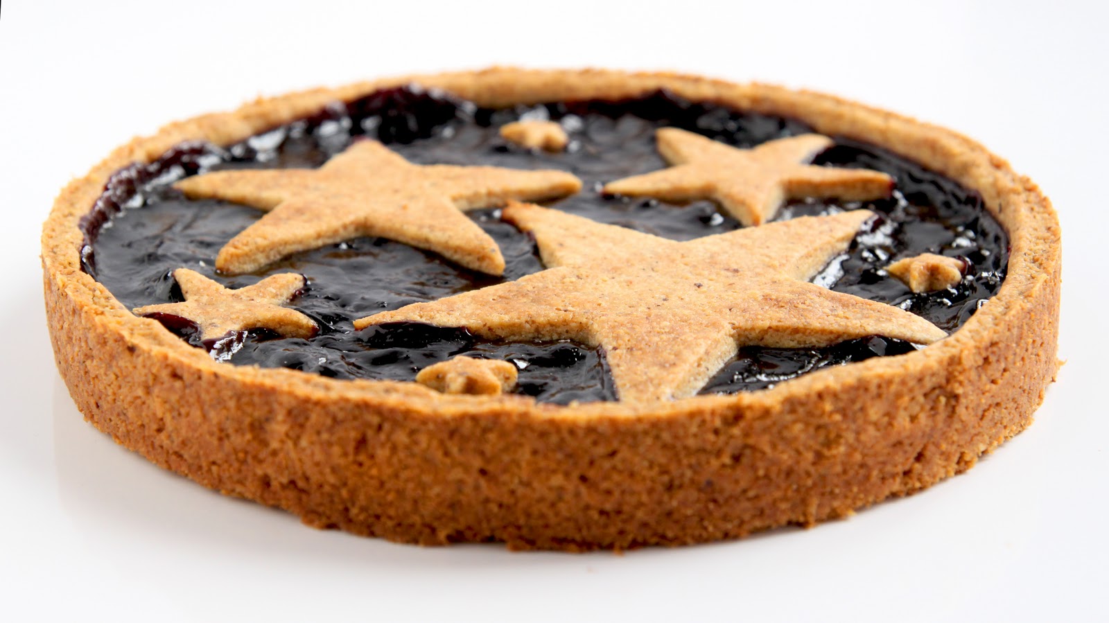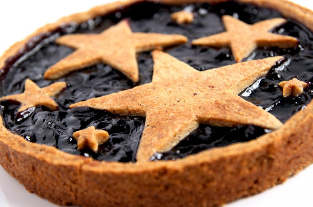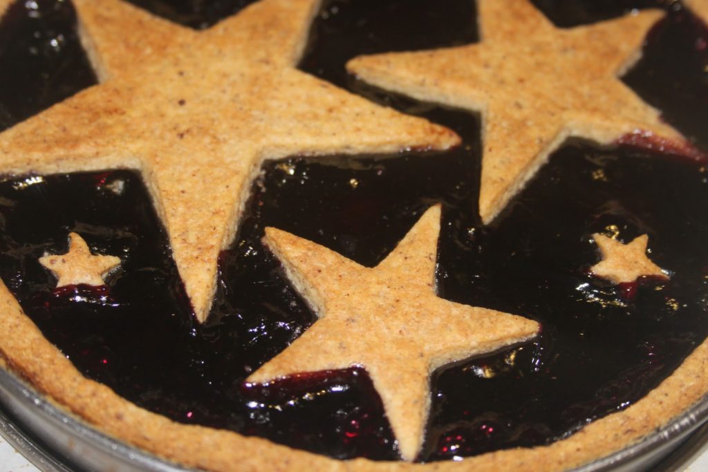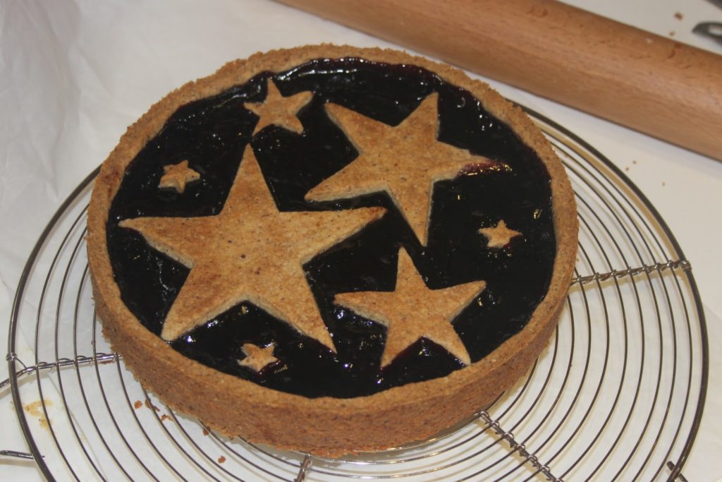 Noël approche à grands pas! En attendant le foie gras méthode 4, je vous donne ma recette de Linzertorte, revisitée pour être encore plus festive! Cette tarte (ou tourte) nous vient d’Autriche (Linz est une ville autrichienne) et est très connue en Hongrie et en Alsace. Une pâte friable (je vous préviens car elle est vraiment friable et savoureuse!) aux noisettes et à la cannelle, avec un intérieur à la confiture de fruits rouges (framboises, myrtilles…). Je vous propose une version aux myrtilles pour créer un ciel nocturne étoilé, mais je mets également la plus traditionnelle.