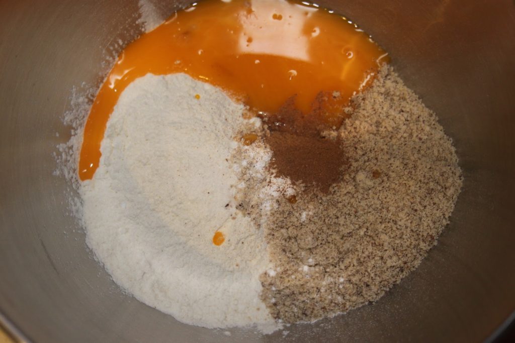 - Placer les jaunes, la cannelle, la poudre de noisettes, la levure chimique, le sucre et la farine dans un bol de robot.