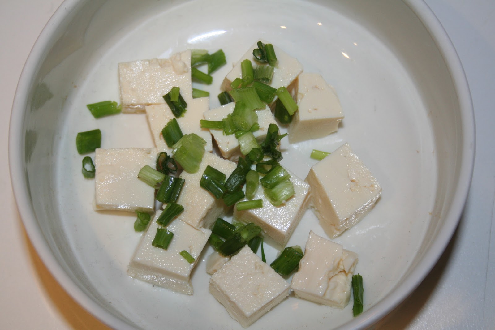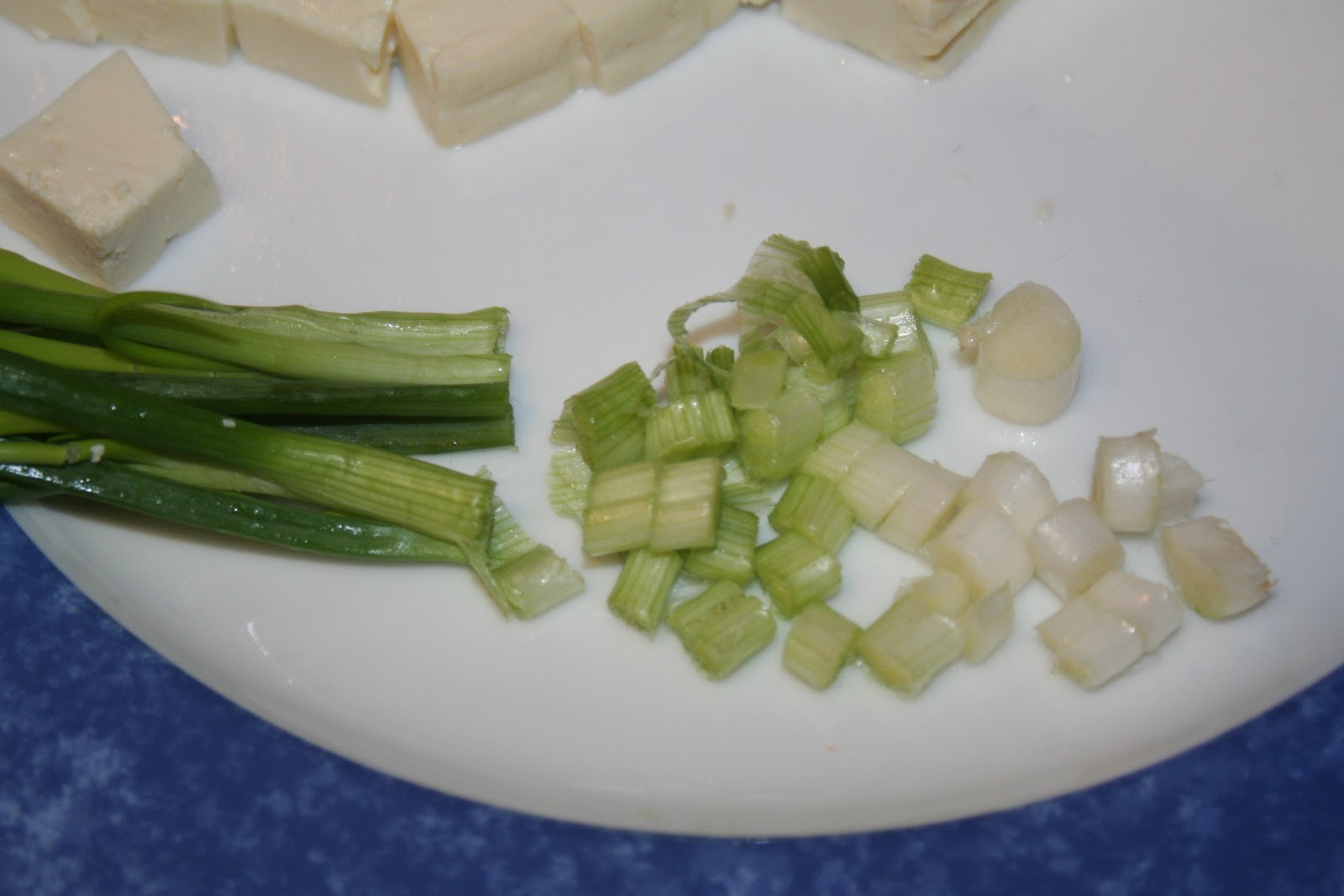- Couper la ciboule en petits morceaux et le tofu en cubes.