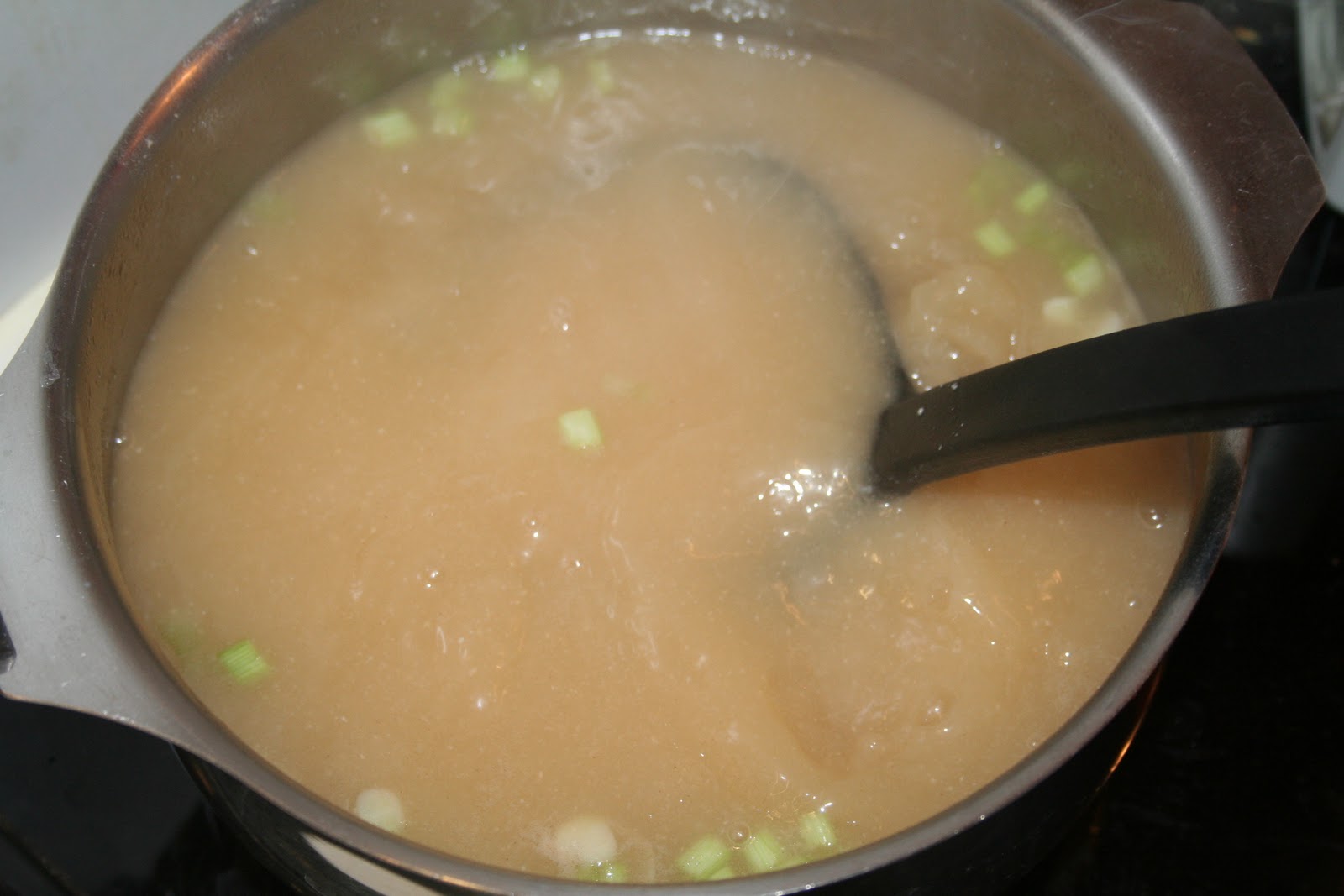 - Verser l’eau et ajouter les cuillerées de pâte de miso. On peut en mettre plus ou moins mais cette quantité que je donne ici convient parfaitement. Mais après tout, chacun son goût.