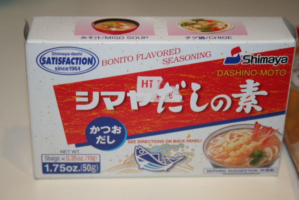 - L’autre ingrédient indispensable est le dashi en poudre. Il existe des boites avec des sachets de 5g ou de 10g. 10g conviennent pour un litre de bouillon et 5g donc pour deux personnes, 500ml.